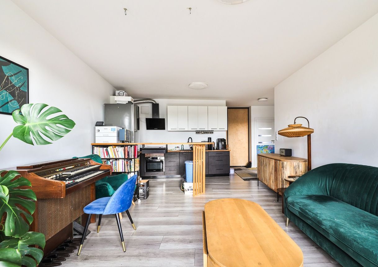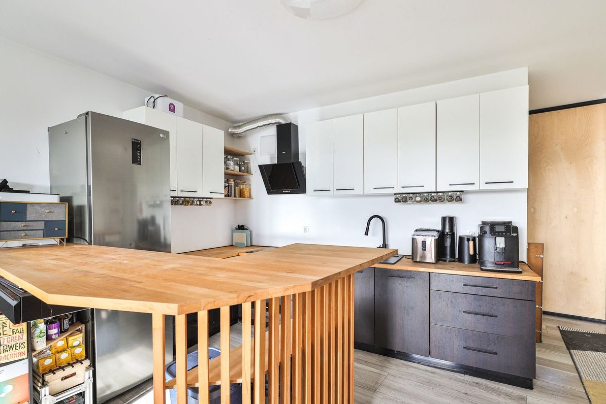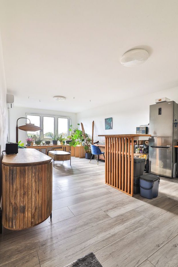 Standard Premium: Ustawny salon z aneksem kuchennym o powierzchni blisko 37 m², wykończony blatami z litego drewna i wysokiej klasy AGD
