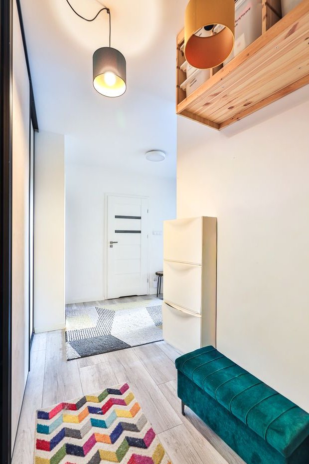 Pojemne szafy w zabudowie w przedpokoju i w sypialni, funkcjonalne szafki w każdym z pokoi
