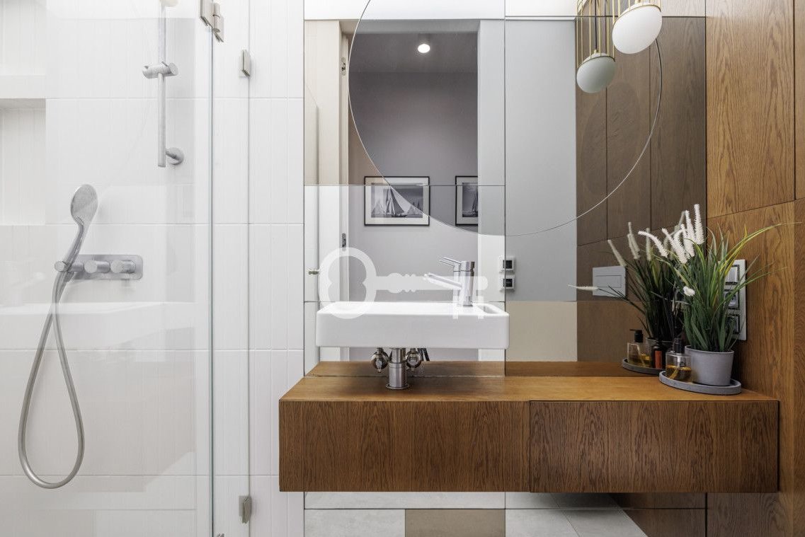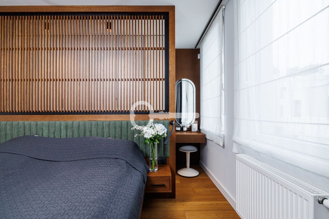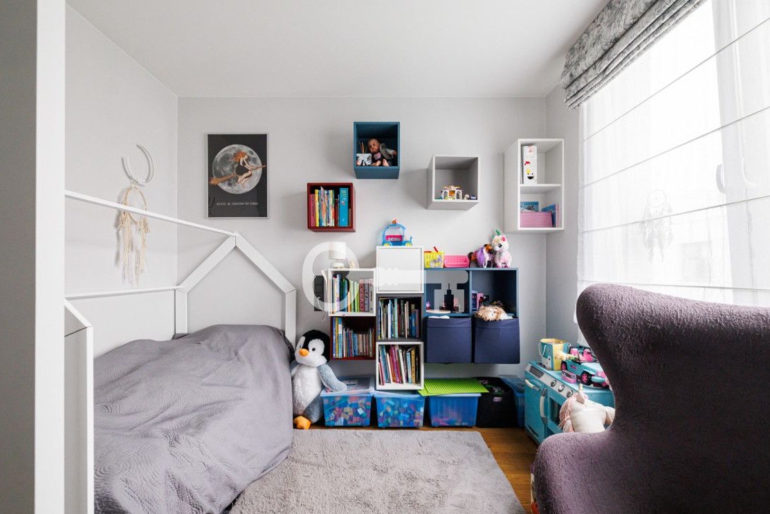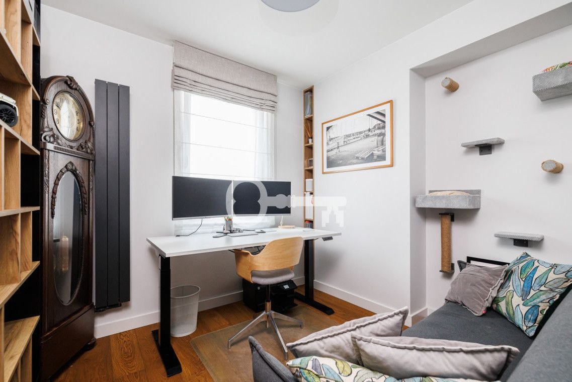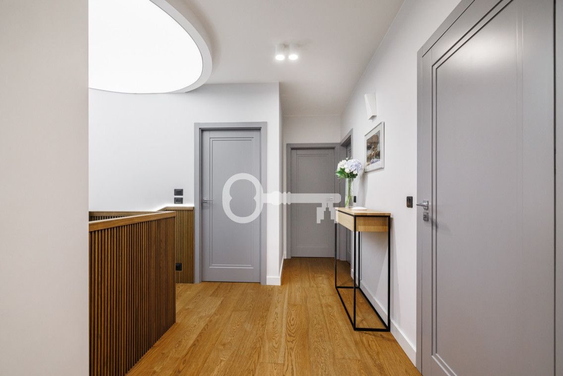 The property features oak flooring that blends attractively with the highest-quality furniture custom-made for this project by the Magma architectural studio. The kitchen countertop made of light quartz sinter, kitchen cabinets made of veneer highlight the uniqueness of this space. In the bathrooms - top-class fixtures and ceramics. Tall door wings, all built-ins custom-made, and perfectly matched lighting emphasize the unique design of this house. The pleated lamp shade in the master bedroom created by Dominique Perrault and Gaelle Lauriot-Prevost, chairs in the living room by Alain van Havre, and the Flower Pot lamp by Verner Panton, designed in 1968, underline the distinctiveness of this project. Underfloor heating and photovoltaic installation contribute to very low maintenance costs of the house. The attractive master bedroom and design-rich walk-in closet add sophistication to the sleeping area.
