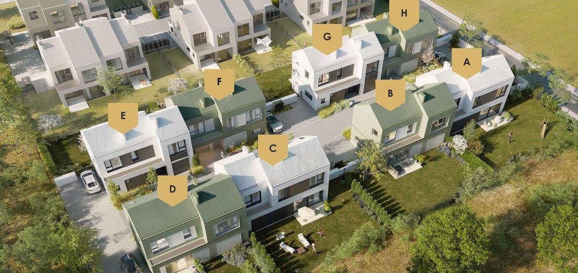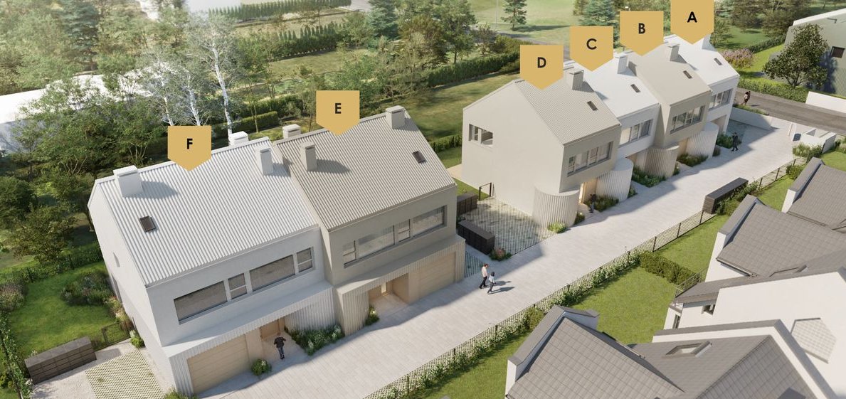 Inwestycja składa się z dwóch rodzajów budynków (zabudowa bliźniacza i szeregowa). Dostępne są zarówno 4 kompaktowe domy w zabudowie szeregowej (powierzchnia 97-101 m2 z poddaszem 55 m2 ) jak i 2 domy w zabudowie bliźniaczej (powierzchnia 145 m2 z poddaszem 82 m2 ).
