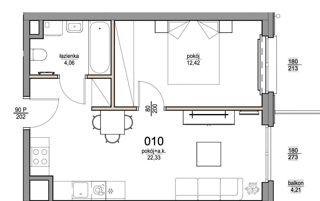 pokój dzienny z aneksem kuchennym 22,33 m2 ,