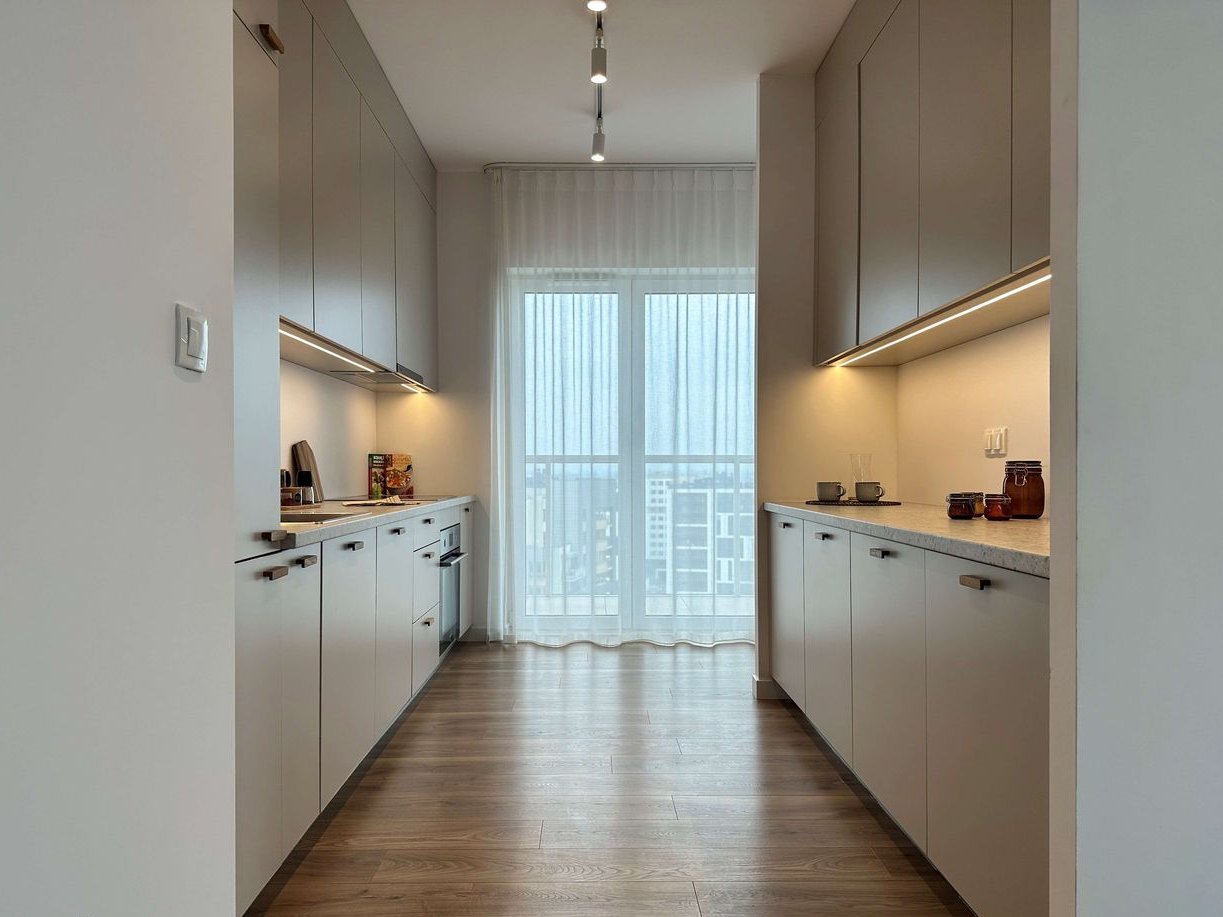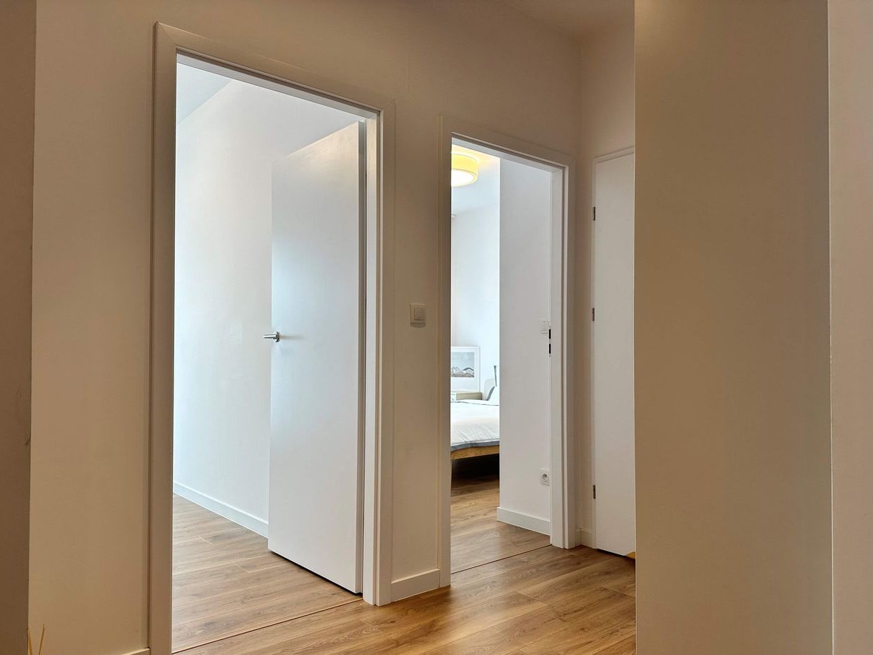 Mieszkanie zaprojektowano z myślą o wygodzie i codziennym komforcie. Wnętrze jest funkcjonalne i przytulne – kuchnia w odcieniach beżu z czarnymi dodatkami, a sypialnie utrzymane w ciepłych, spokojnych kolorach sprzyjających odpoczynkowi. Całość dopełniają drewniane podłogi i jasne ściany, które nadają przestrzeni lekkości i harmonii.