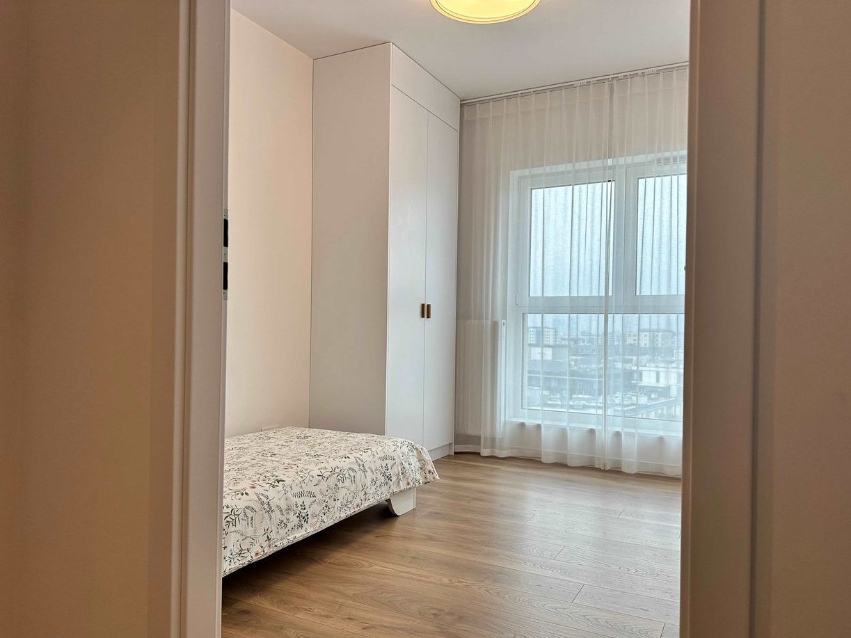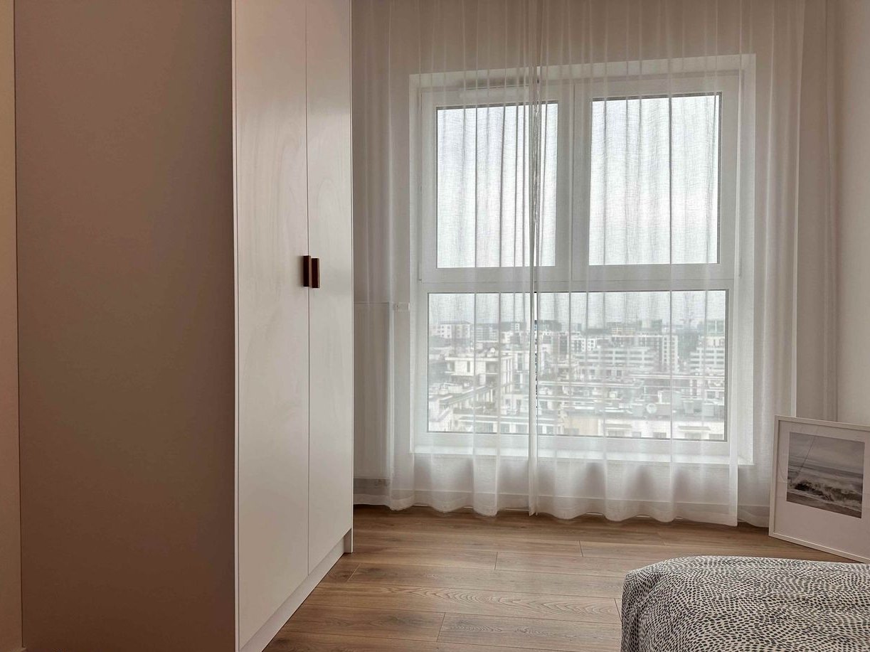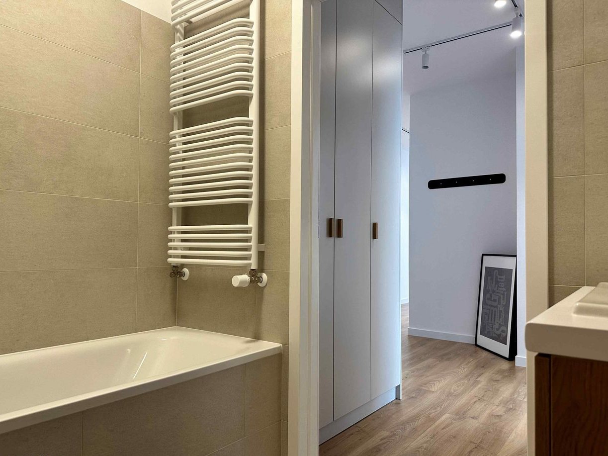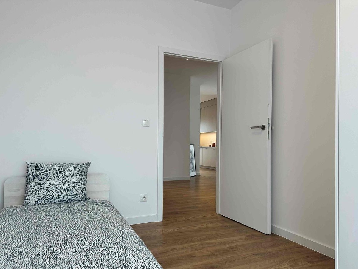 The apartment has been designed with convenience and everyday comfort in mind. The interior is functional and cozy – the kitchen is decorated in shades of beige with black accents, and the bedrooms are decorated in warm, calm colors conducive to rest. The whole is complemented by wooden floors and light walls, which give the space lightness and harmony.