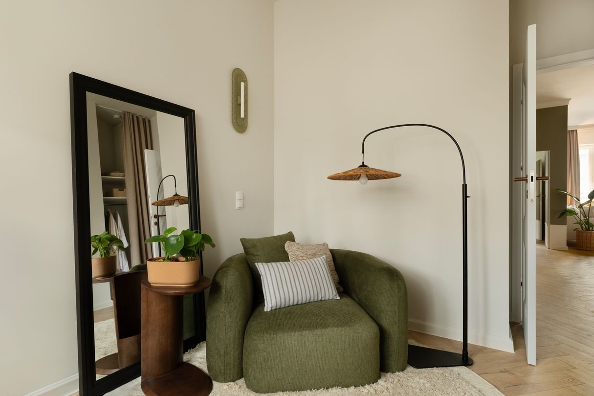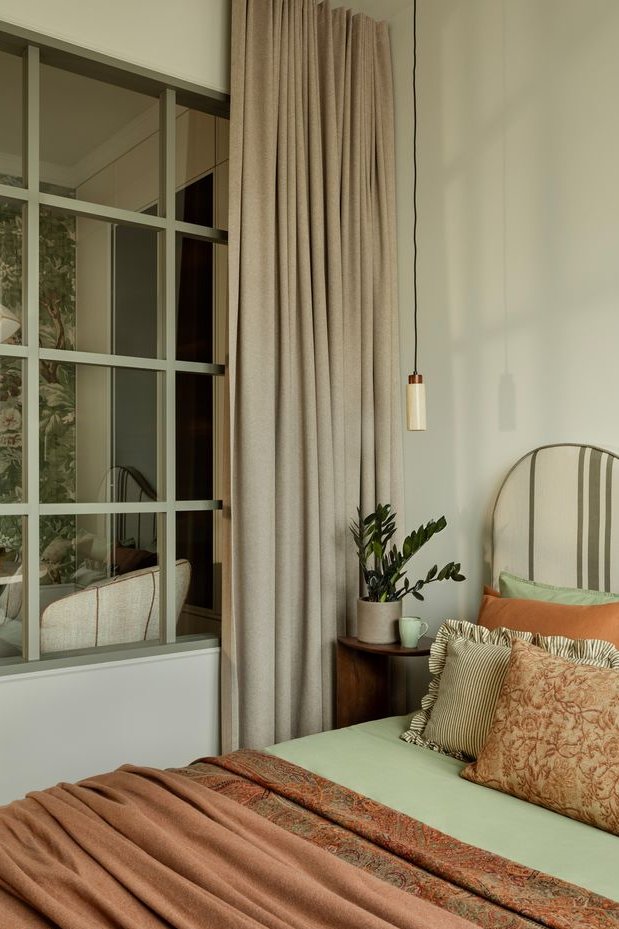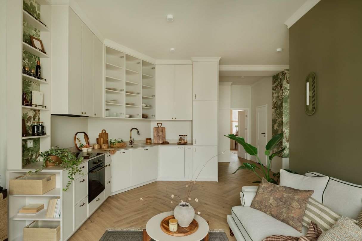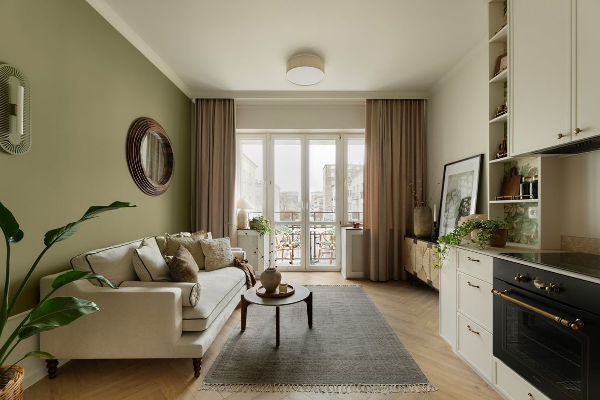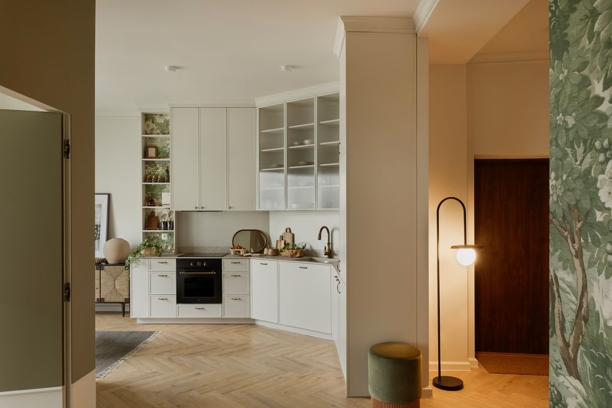 Nie jest to wnętrze urządzone, by urzekało. Ono urzeka, bo jest stworzone z sercem. Procesem projektowym od samego początku kierowała myśl, żeby na niezbyt wygórowanym metrażu, wykreować wrażenie przestrzeni i kontynuacji panoramicznego widoku na Och Teatr. Ten niemalże paryski kadr balkonowy sprawił, że wnętrze jest połączeniem klasyki, nonszalancji miejskich kamienic i lekkości zamkniętej w motywie roślinnym.