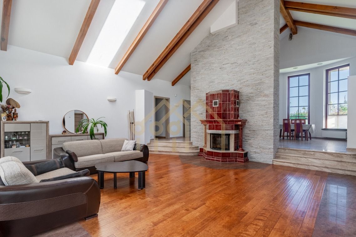 - Przestronny salon (47,99 m2) widokiem na las, kominkiem oraz wyjściem na taras