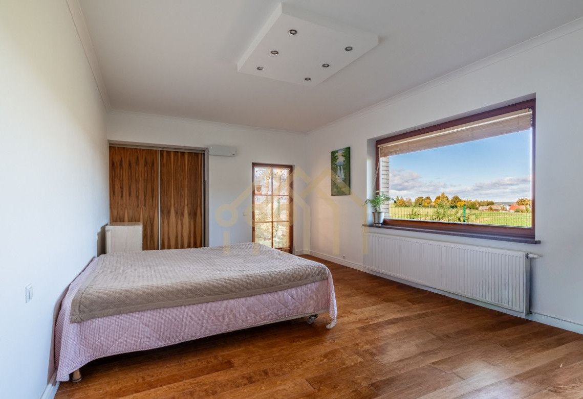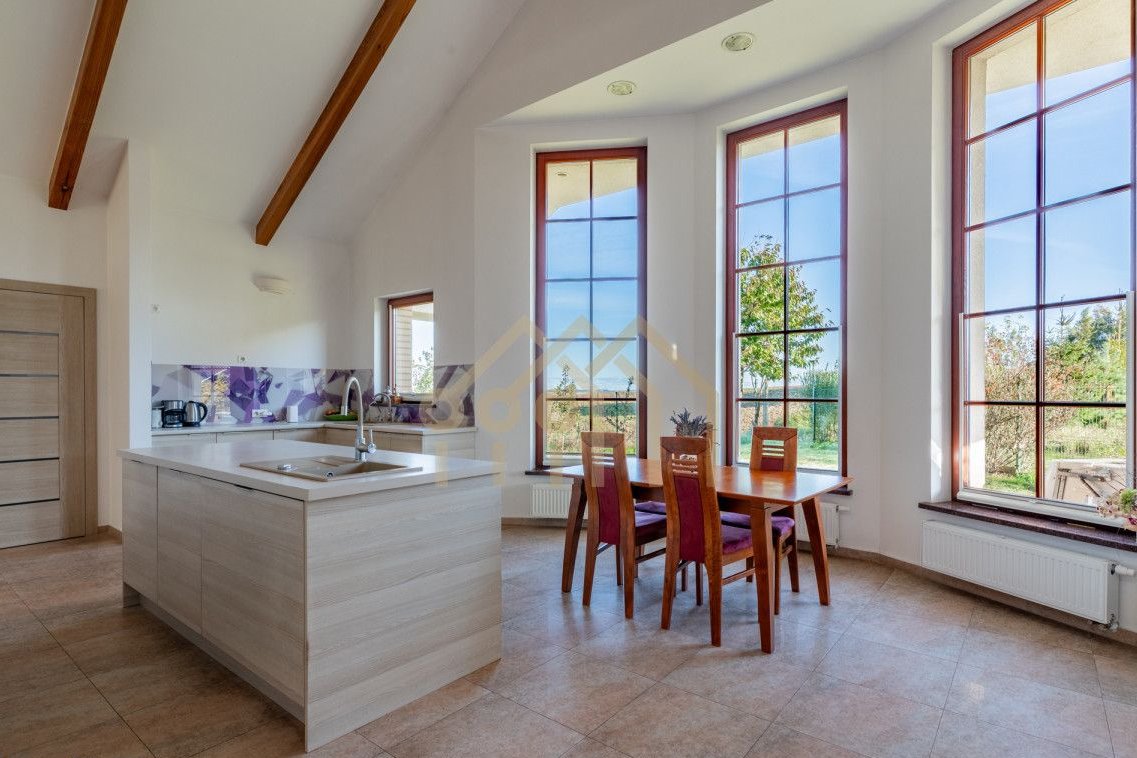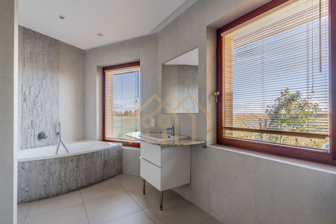 Okna domu są drewniane, nowej generacji, a pomieszczenia są świetnie doświetlone. Ekspozycja okien domu skierowana jest na wszystkie strony świata. Zarówno w środku, jak i na zewnątrz parapety wykonane są z granitu.