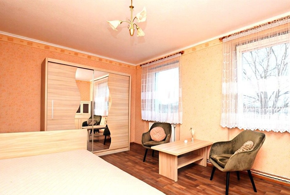 - Podłoga w pokojach wyłożona wykładziną PCV