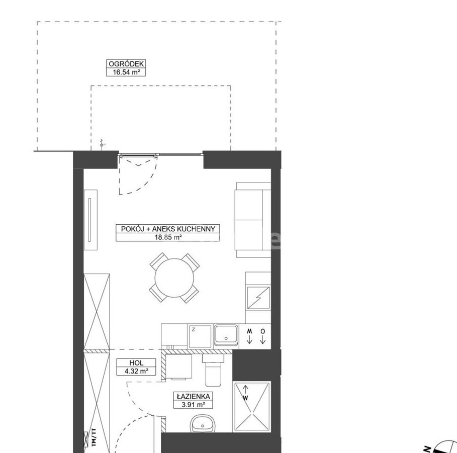 Metraż: 32,59 m² | ogródek 16,54 m² | parter | 1 pokój z aneksem