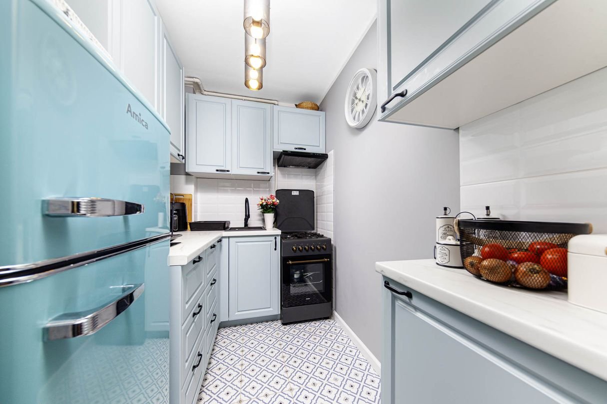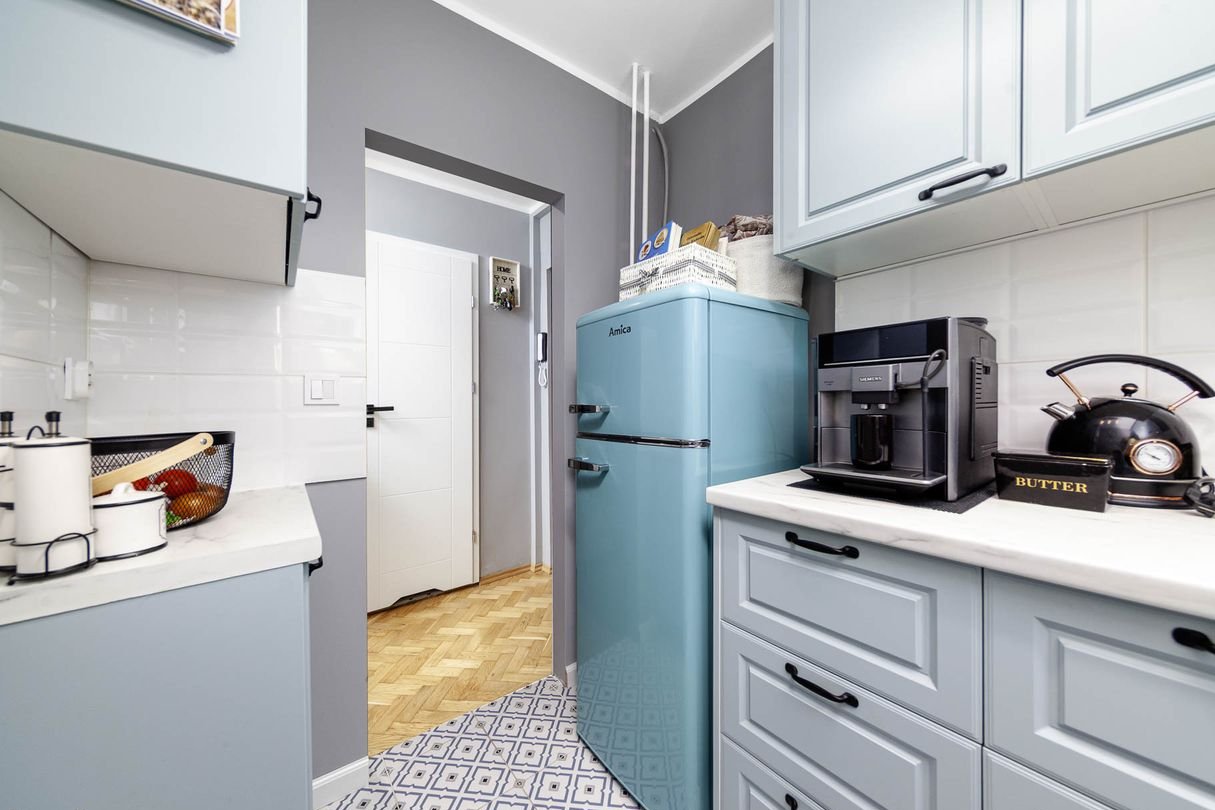 Kuchnia: oddzielna, z pełnym wyposażeniem (designerska lodówka, kuchenka gazowa z piekarnikiem, pochłaniacz) i pastelową zabudową meblową z jasnymi blatami.