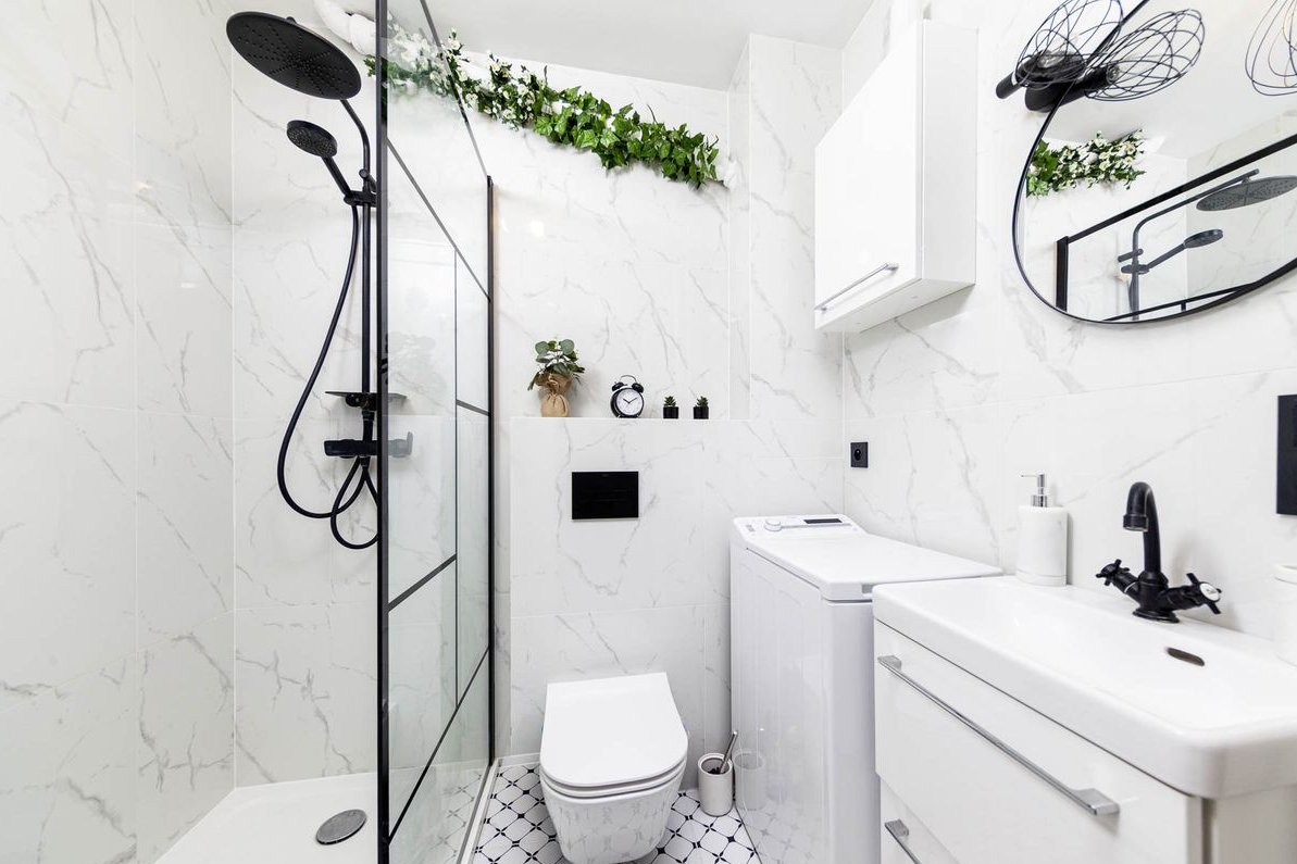Łazienka: nowoczesna, z prysznicem, pralką i elegancką armaturą.