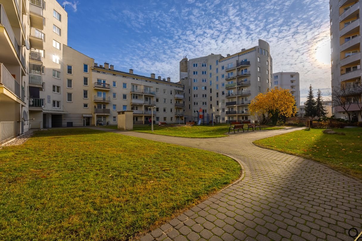 Na terenie znajduje się zielone patio z placem zabaw i piaskownicą.