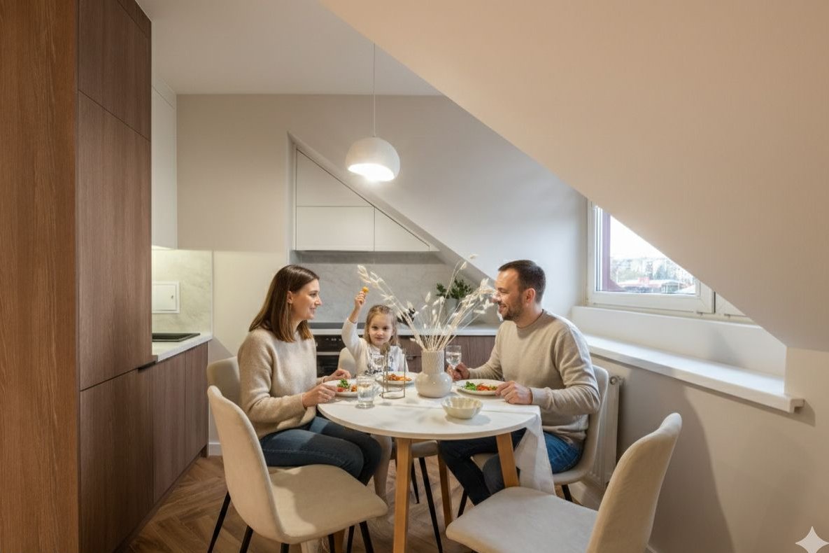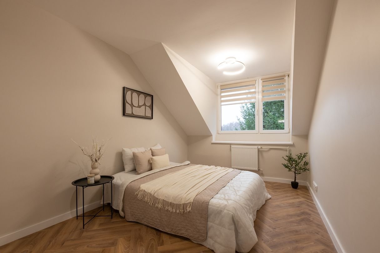 Klimat: Mieszkanie o wyjątkowym układzie, dwustronne, jasne, z widokiem na zieleń z obu sypialni oraz poddaszem.