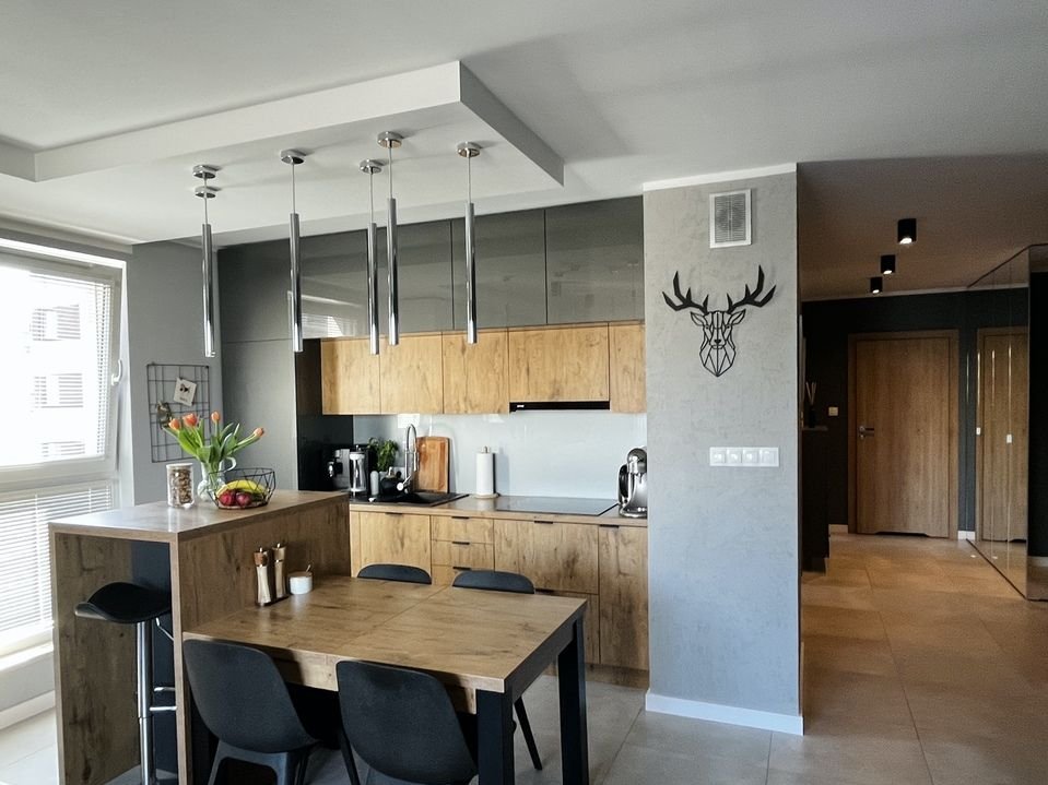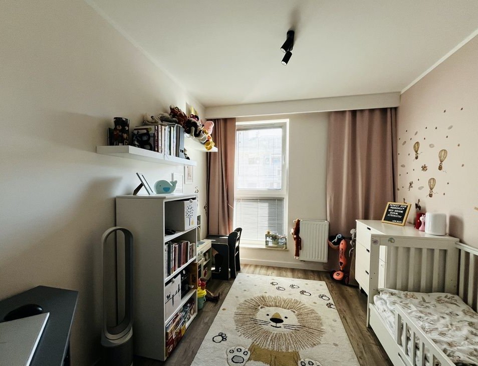 Mieszkanie jasne, dwustronne, gotowe do zamieszkania. Zaprojektowane przez architekta, wykończone z wysokiej jakości materiałów. Składa się z salonu z kuchnią (22,97 m2), 2 pokoi (10,48 m2 i 9,25 m2), łazienki (4, 14 m2), przedpokoju (11,5 m2) oraz balkonu (4,83 m2). Wysokość pomieszczeń: 2,55 m. Na podłogach panele i terakota. Kuchnia otwarta na salon, umeblowana i wyposażona (meble na wymiar, lodówka, zmywarka, piekarnik, okap, płyta indukcyjna). W salonie zainstalowana klimatyzacja oraz rozprowadzona instalacja do kina domowego. W łazience wanna z parawanem nawannowym oraz szafki na wymiar. 2 duże zabudowane szafy w sypialni i w przedpokoju (z miejscem na pralkę). Okna PCV z wbudowanymi nawietrzakami o ekspozycji wschodniej i północnej. We wszystkich oknach zamontowane żaluzje. Ogrzewanie i ciepła woda z sieci miejskiej. Czynsz: 804 zł/m-c, dodatkowo płatny prąd według zużycia. Parkowanie: wynajęte miejsce w garażu podziemnym (koszt 250 zł/m-c, istnieje możliwość odstąpienia umowy najmu). Forma własności: odrębna własność. Dostępne: do uzgodnienia.