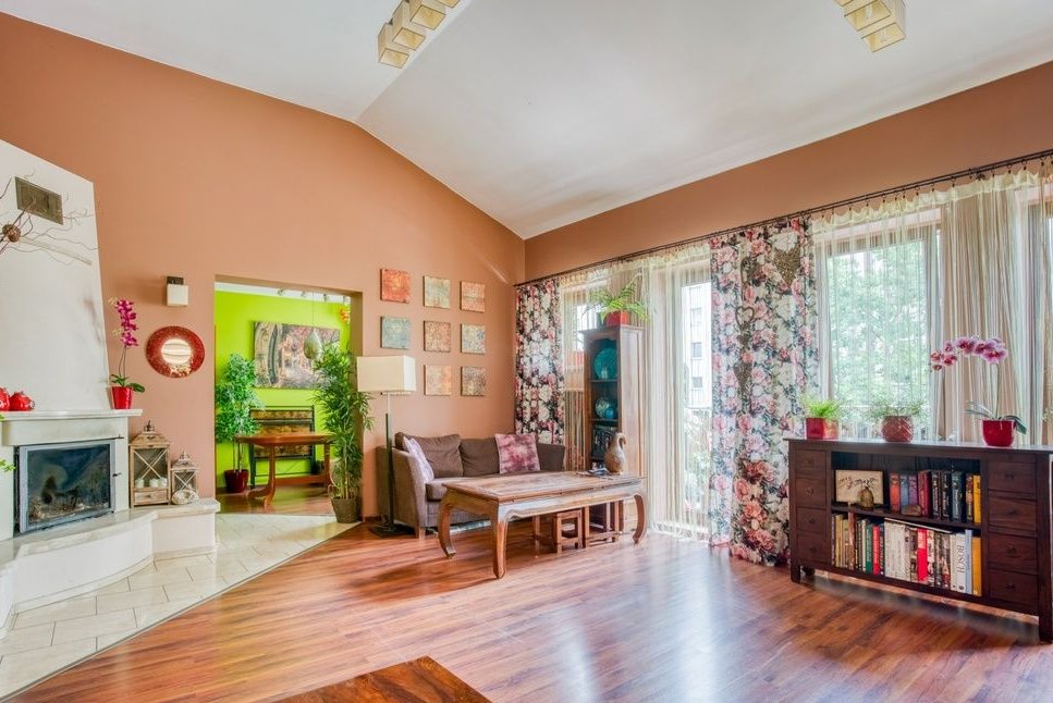Bardzo wysokie sufity w salonie podkreślają przestronność mieszkania oraz jego charakter.