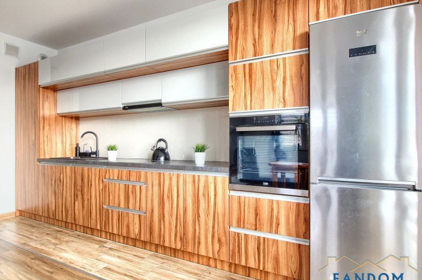 Przestronny salon z kuchnią wyposażony w wysokiej jakości meble - rozkładaną sofę, szafkę RTV, zabudowę mebli kuchennych skrywającą sprzęty AGD: lodówkę, zmywarkę, piekarnik, płytę indukcyjną. W łazience wanna z prysznicem. W oddzielnym pomieszczeniu znajduje się pralka, suszarka na ubrania oraz inne sprzęty domowego użytku. W przedpokoju szafa w zabudowie.
