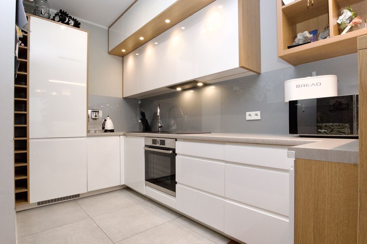 Nieruchomość o powierzchni 74 m² składa się z dwóch oddzielnych sypialni, garderoby, łazienki, przedpokoju oraz bardzo przestronnego salonu z aneksem kuchennym o powierzchni prawie 30m2. Dodatkowo, do mieszkania przynależą dwa tarasy zewnętrzne o powierzchni ok. 7,6 m² każdy. Istnieje możliwość aranżacji dodatkowego (czwartego) pokoju w salonie poprzez dobudowanie ścianki działowej. Mieszkanie wykończono w podwyższonym standardzie według indywidualnego projektu. Na podłogach położono bambusową deskę w kolorze karmelowym, a łazienka wyłożona jest płytkami gresowymi, wyposażona w dyskretne, funkcjonalne oświetlenie oraz zabudowę meblową z miejscem na pralkę i suszarkę. Dodatkowo w łazience znajduje się prysznic typu walk-in. Aneks kuchenny wyposażono w wysokiej klasy sprzęt AGD marki BOSCH oraz indywidualnie zaprojektowaną zabudowę meblową z półwyspem otwartym na salon.