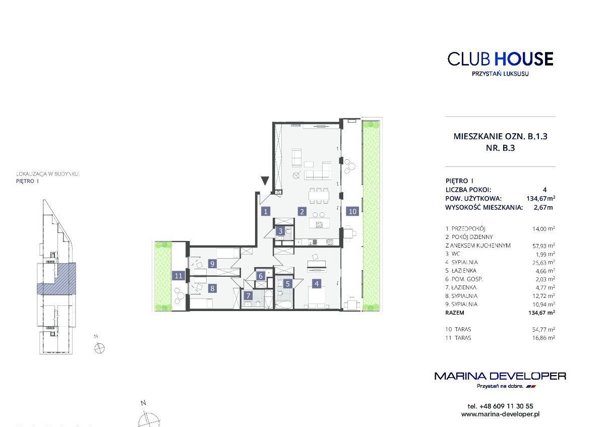 Mieszkanie czteropokojowe znajdujące się na pierwszym piętrze oznaczone jest symbolem B.1.3 i ma powierzchnię 134 m. kw. Wystawa okien jest na stronę wschodnią oraz zachodnią. Do mieszkania przynależy dodatkowo taras o powierzchni 71 m. kw.