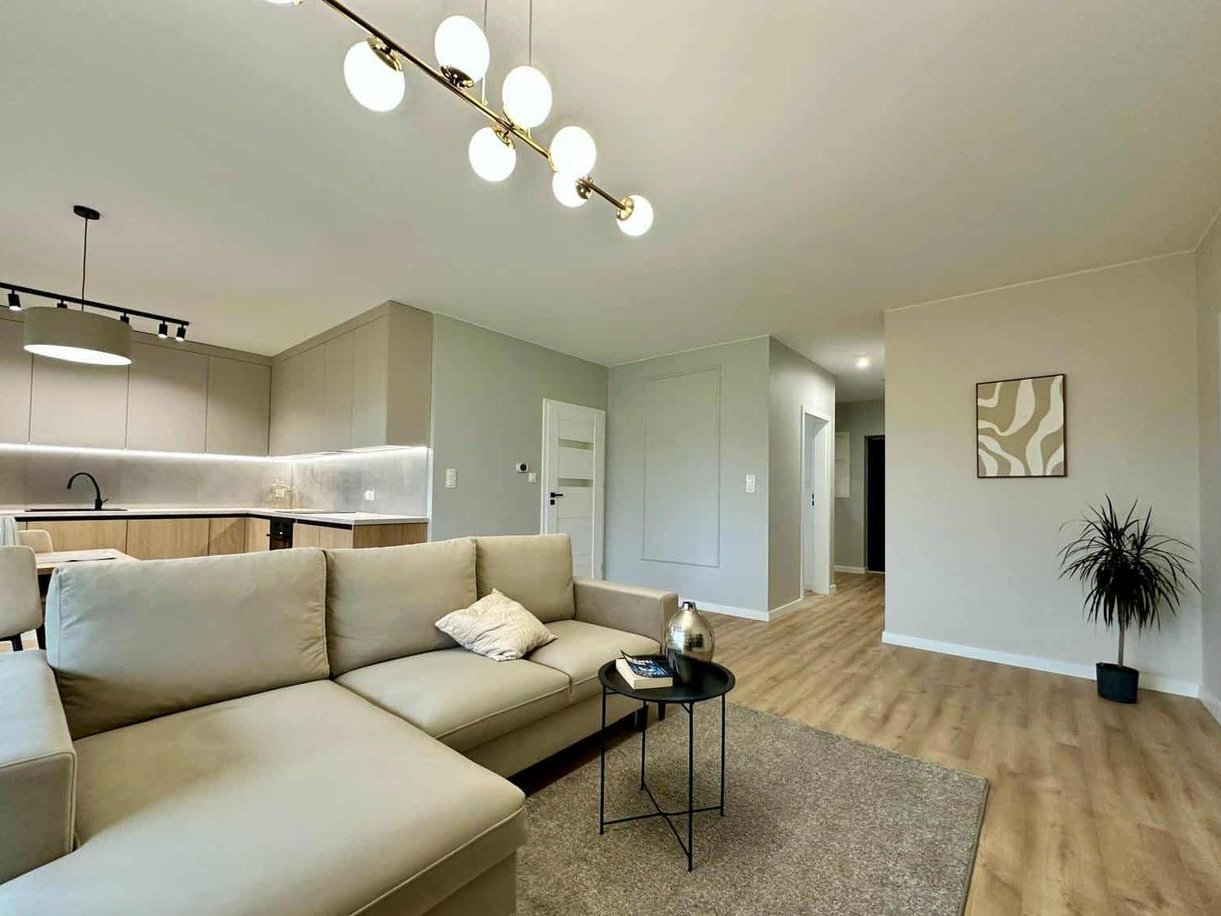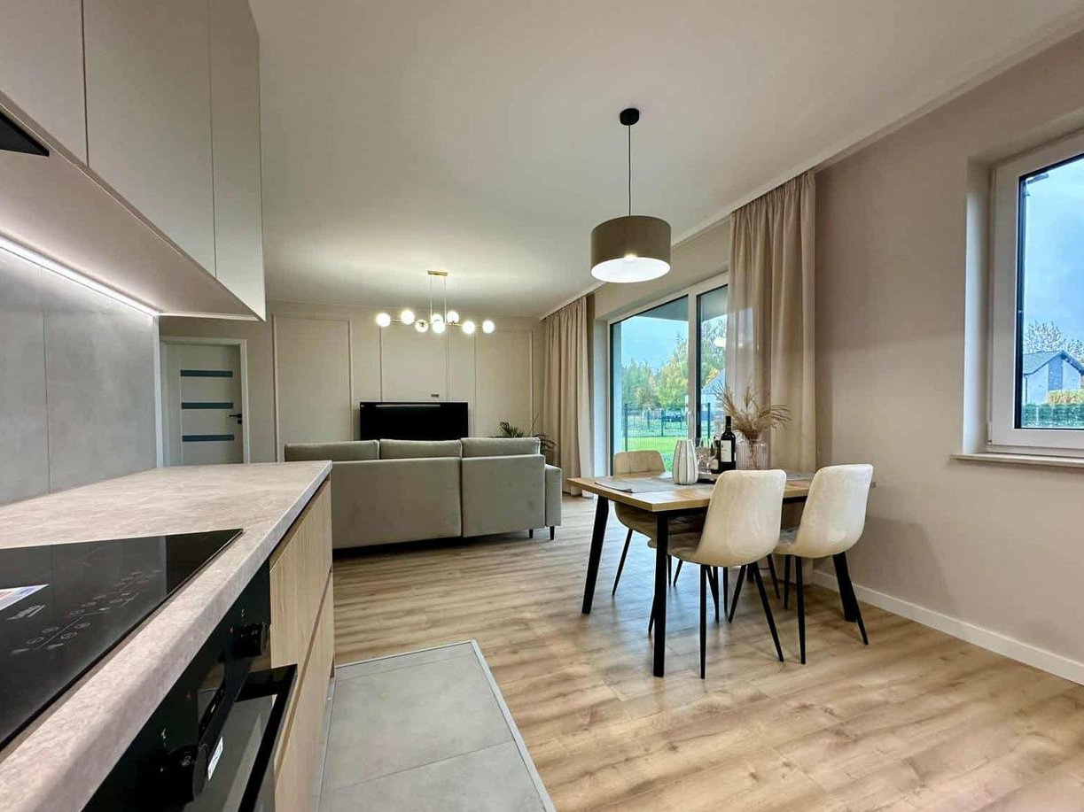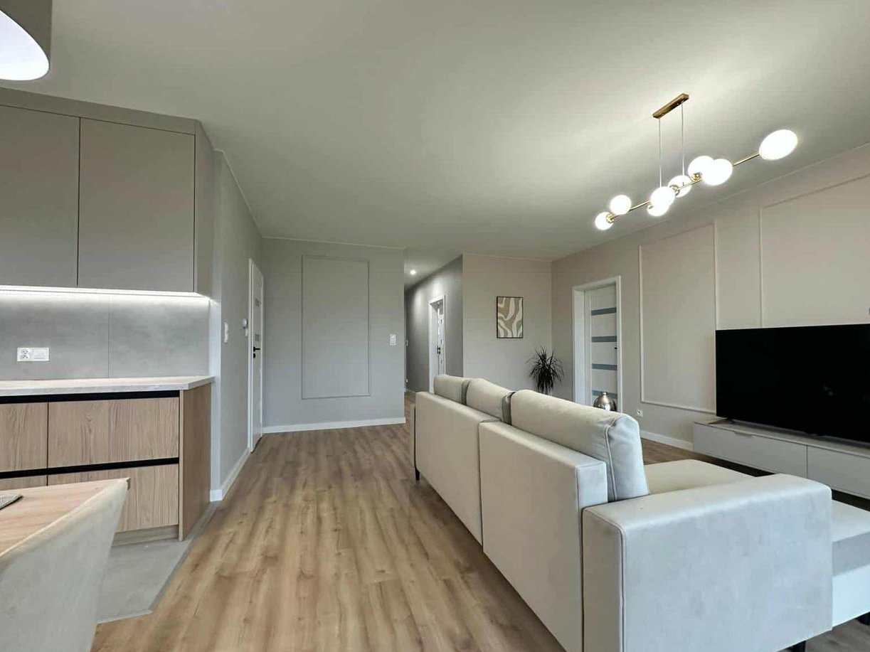 Mieszkanie częściowo umeblowane, wyposażone w wysokiej klasy sprzęt RTV i AGD, w tym płytę indukcyjną, piekarnik, zmywarkę, okap, lodówkę oraz telewizor.