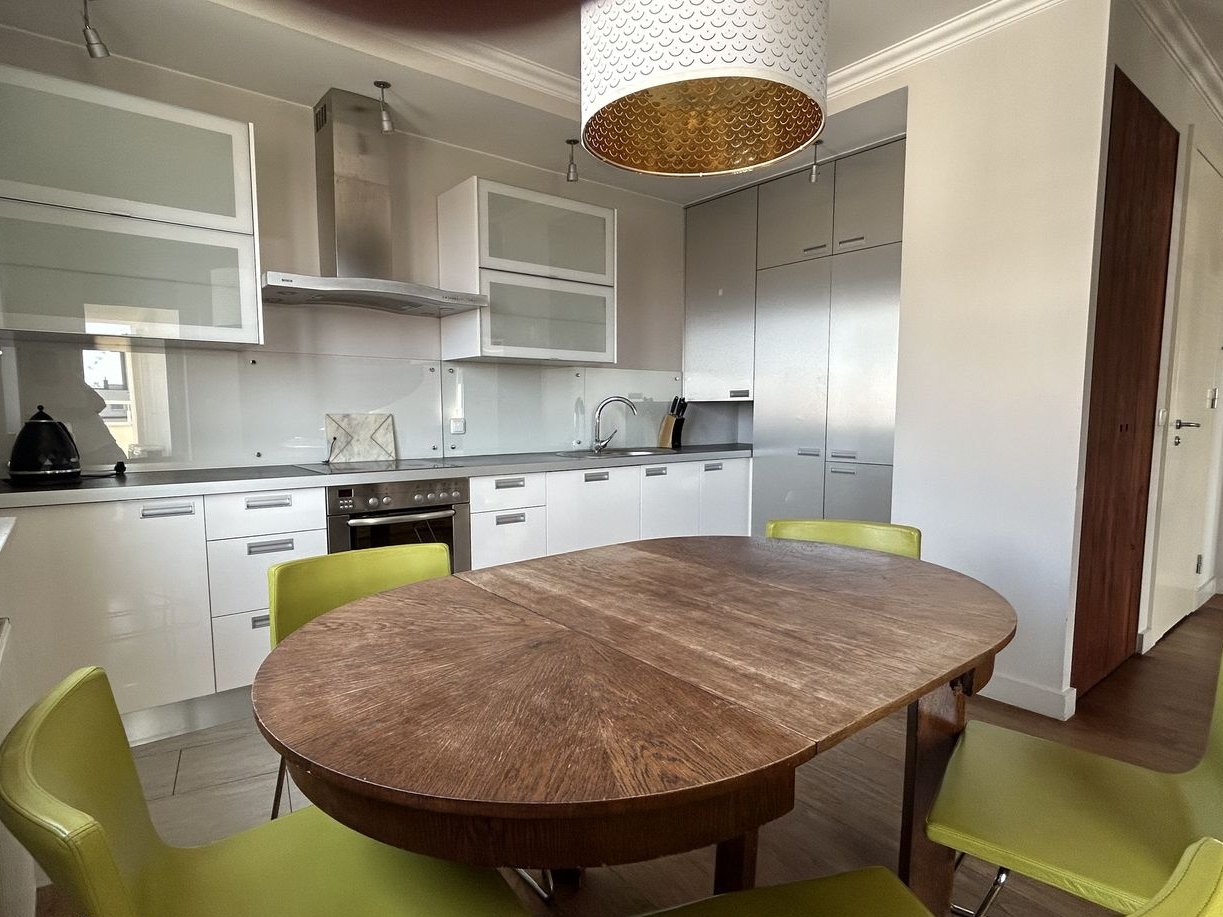 • nowoczesna jasna kuchnia z własnym wyjściem na balkon