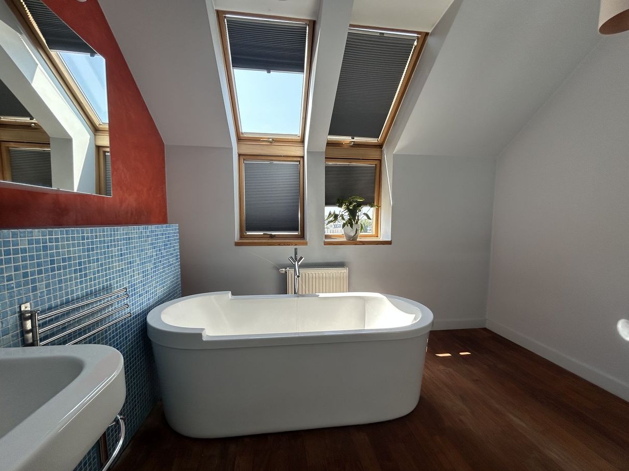 Kolejnymi, plusami, o których warto wspomnieć są: ilość światła w pomieszczeniach, uzyskana dzięki odpowiedniej liczbie okien i wysokości pomieszczeń oraz klimatyzacja, zapewniająca przyjemny chłód w gorące dni, których jest coraz więcej w otaczającej nas nowej rzeczywistości klimatycznej.