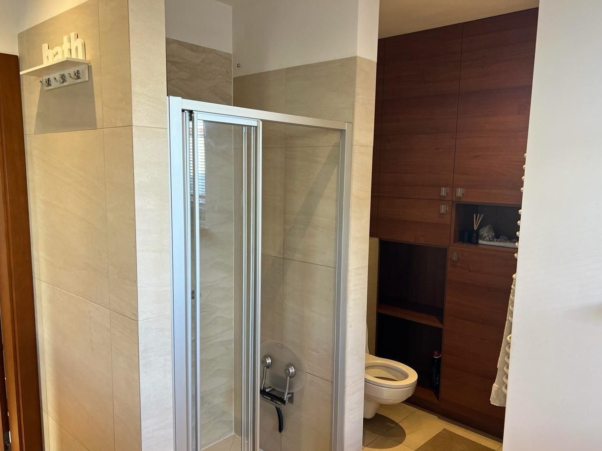 Przestrzeń uzupełnia duża zabudowana szafa, zapewniająca wygodne przechowywanie. Na tym poziomie mieści się również przestronna łazienka wyposażona w wannę z hydromasażem (jacuzzi), oddzielny prysznic, duże lustro oraz funkcjonalną strefę do przechowywania kosmetyków.