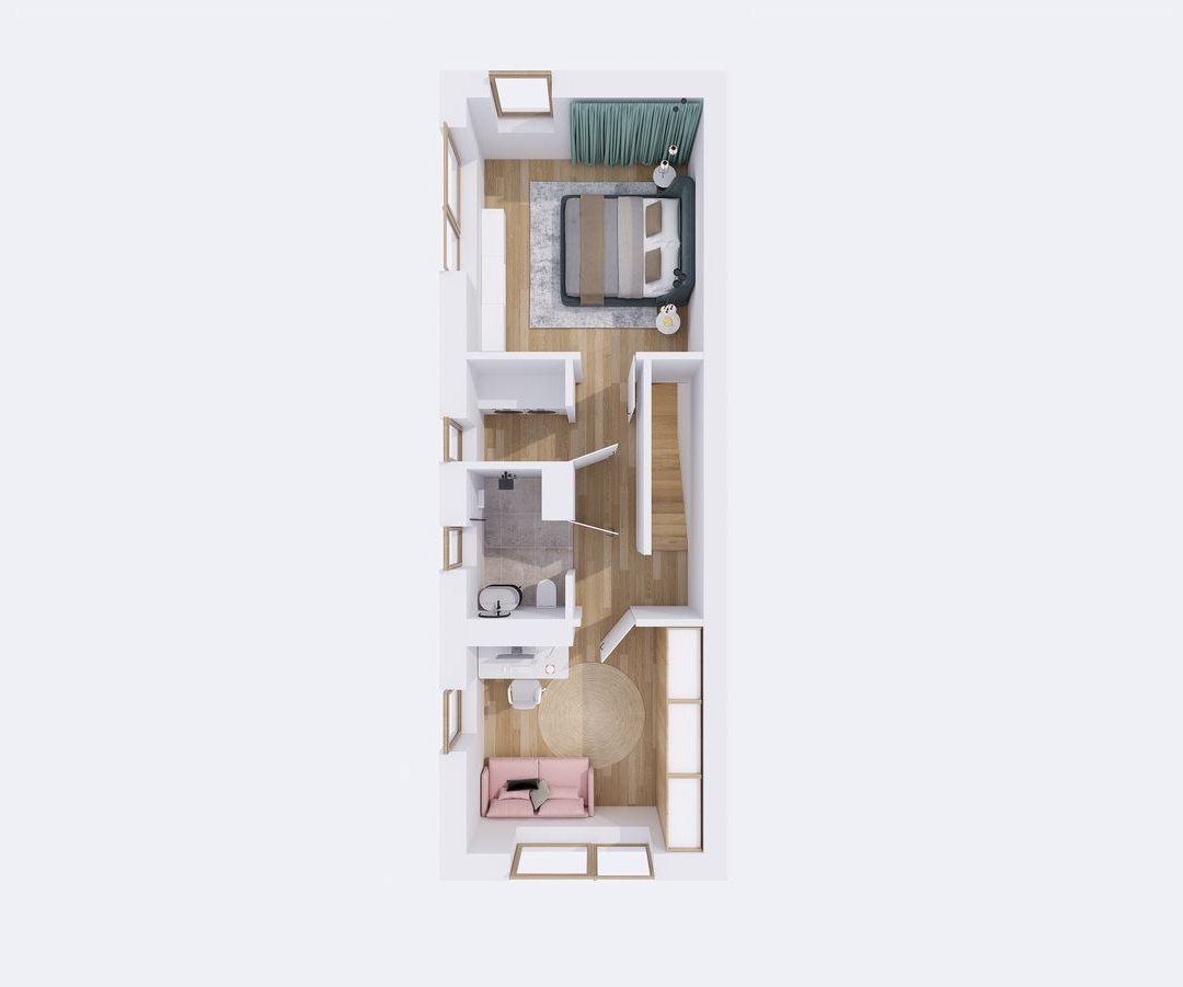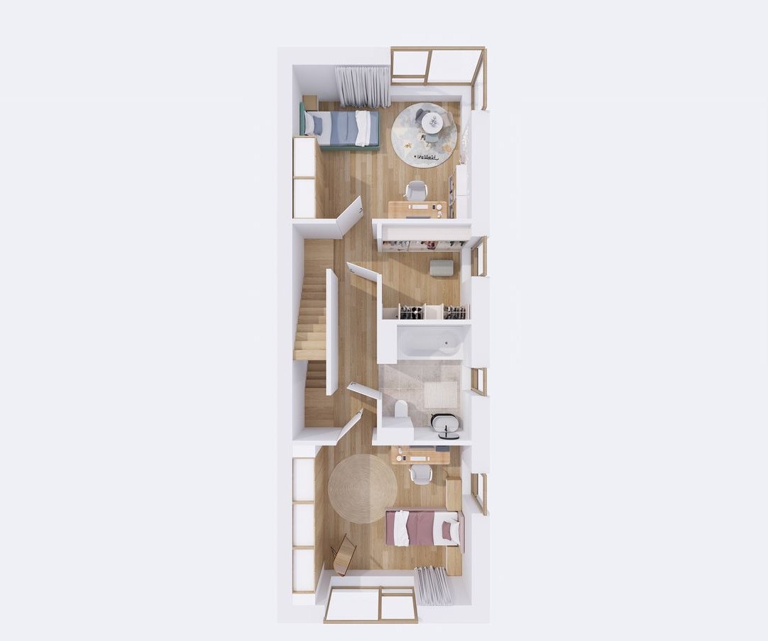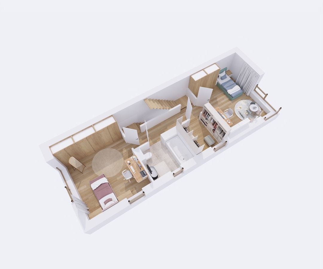 Ostatnia kondygnacja to kolejne dwa pokoje, łazienka, a także pomieszczenie techniczne. W sytuacji, gdy nie potrzebujemy czterech sypialni ostatnią kondygnację można zaaranżować według własnych potrzeb.