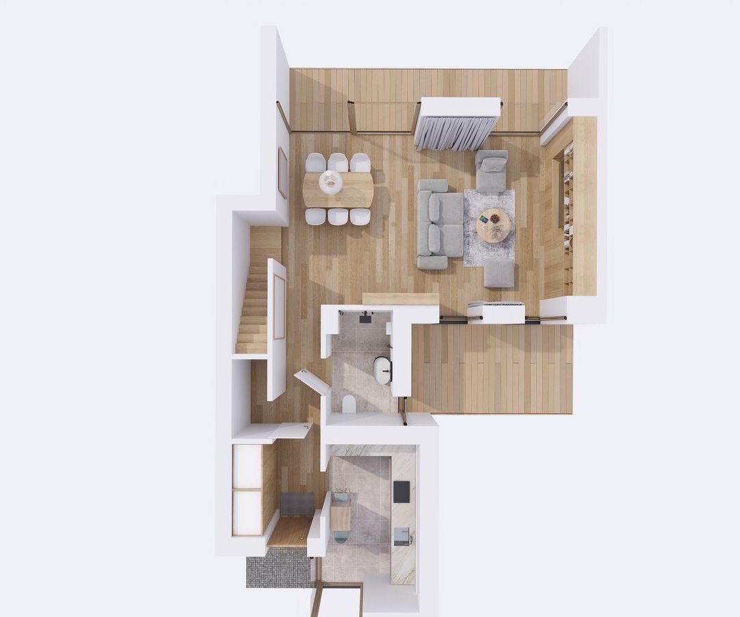 Na parterze znajduje się przestronny salon, łazienka, kuchnia oraz schowek. Lokalizację kuchni można zmienić uzyskując w ten sposób dodatkowe pomieszczenie.