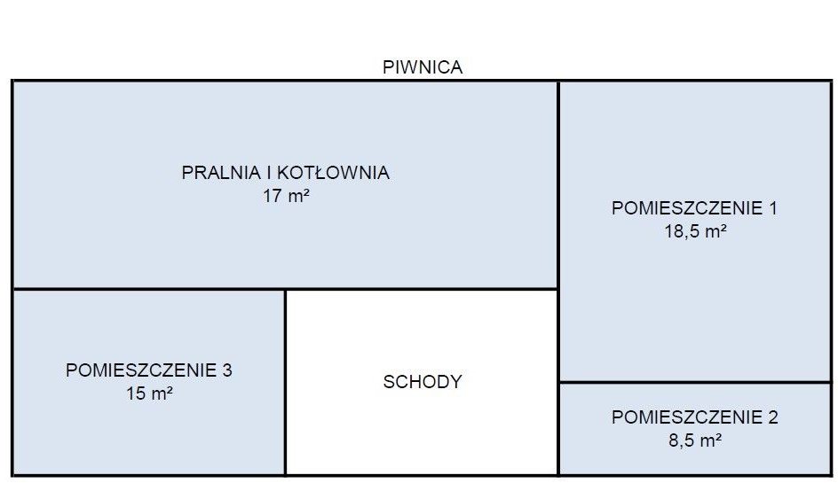 Piwnica: 3 pomieszczenia gospodarcze (8,5 m2, 15 m2 i 18,5 m2 – z małym oknem), pralnia z kotłownią (17 m2).