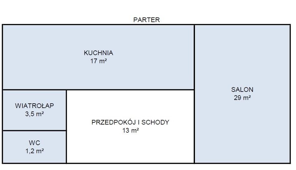 Parter: Salon z kominkiem (29 m2), oddzielna kuchnia z jadalnią (17 m2), WC (1,2 m2), wiatrołap (3,5 m2).