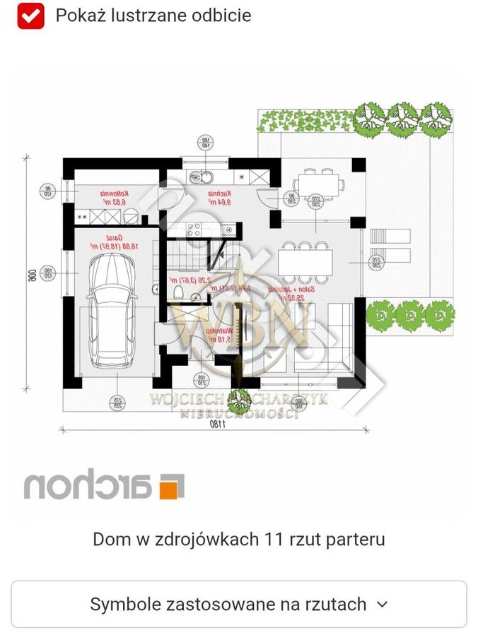 PARTER69,85(72,22) 1. Wiatrołap5,182. Hol1,74(2,61)3. Toaleta2,26(3,67)4. Salon + Jadalnia25,325. Kuchnia9,646. Kotłownia6,837. Garaż18,88(18,97)