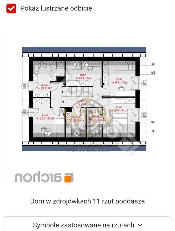 PODDASZE64,75(81,57) 1. Hol i schody11,882. Łazienka7,87(9,56)3. Pokój10,36(12,05)4. Pralnia4,16(6,11)5. Garderoba3,26(4,72)6. Pokój11,18(14,42)7. Pokój9,67(12,90)8. Pokój6,37(9,93)