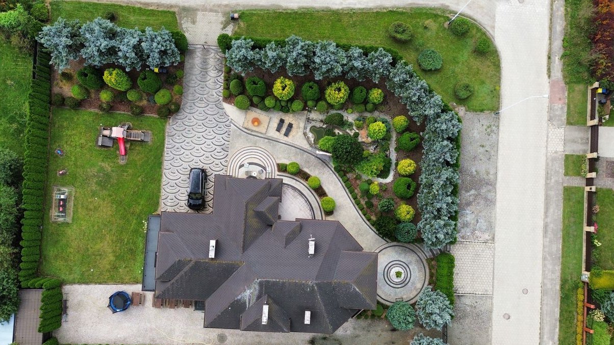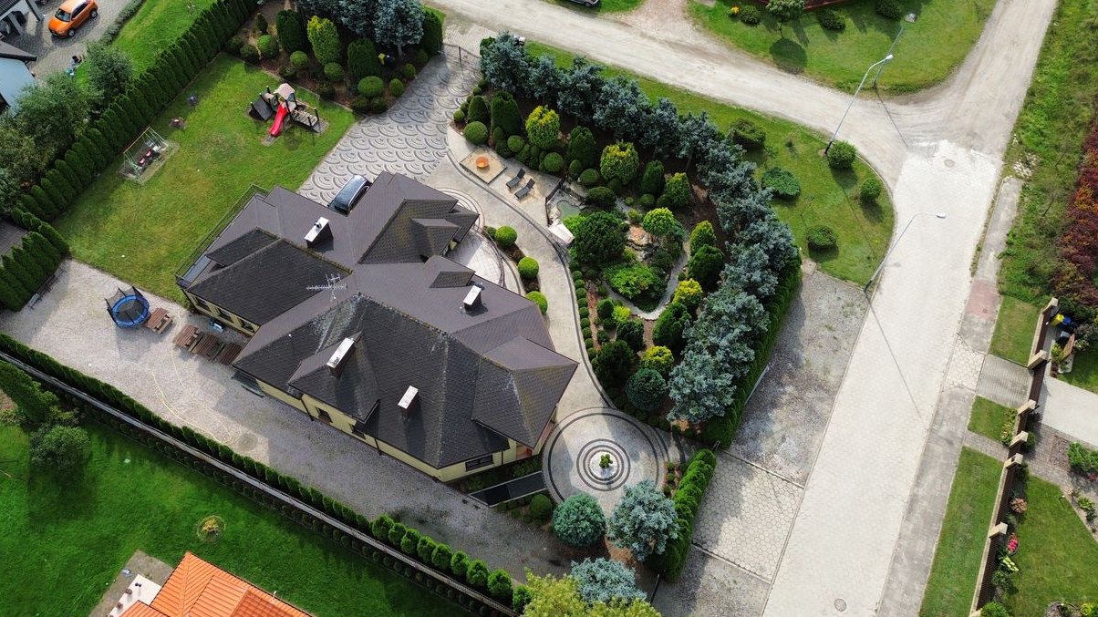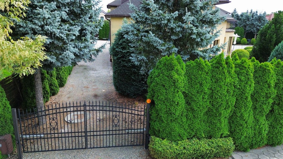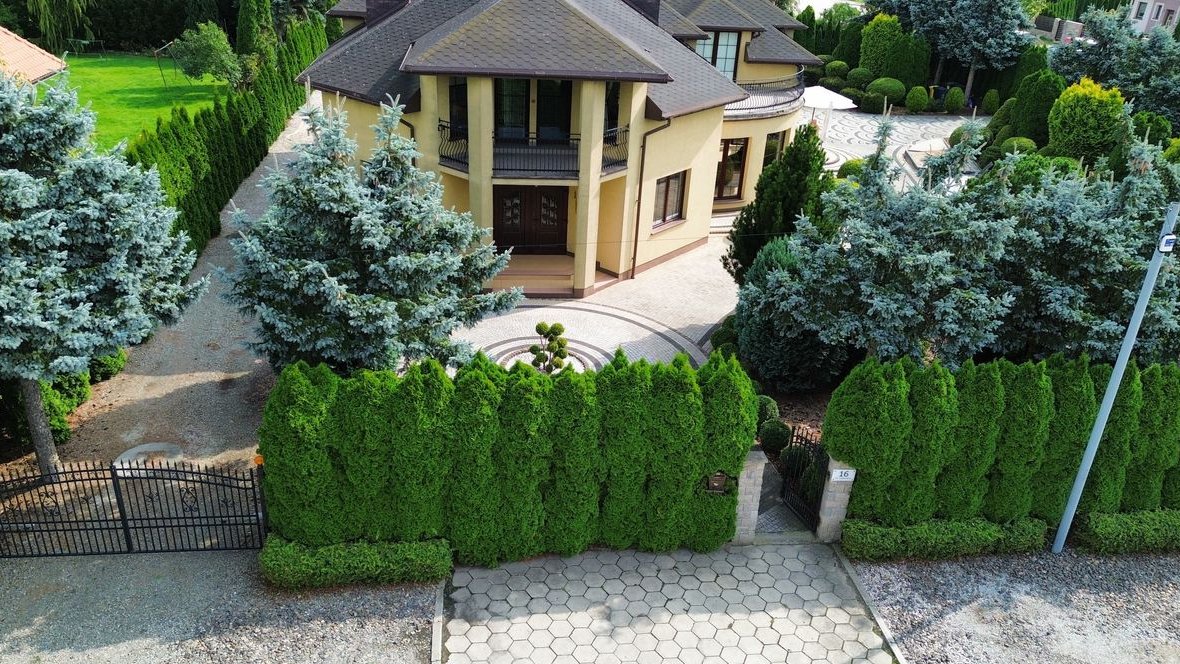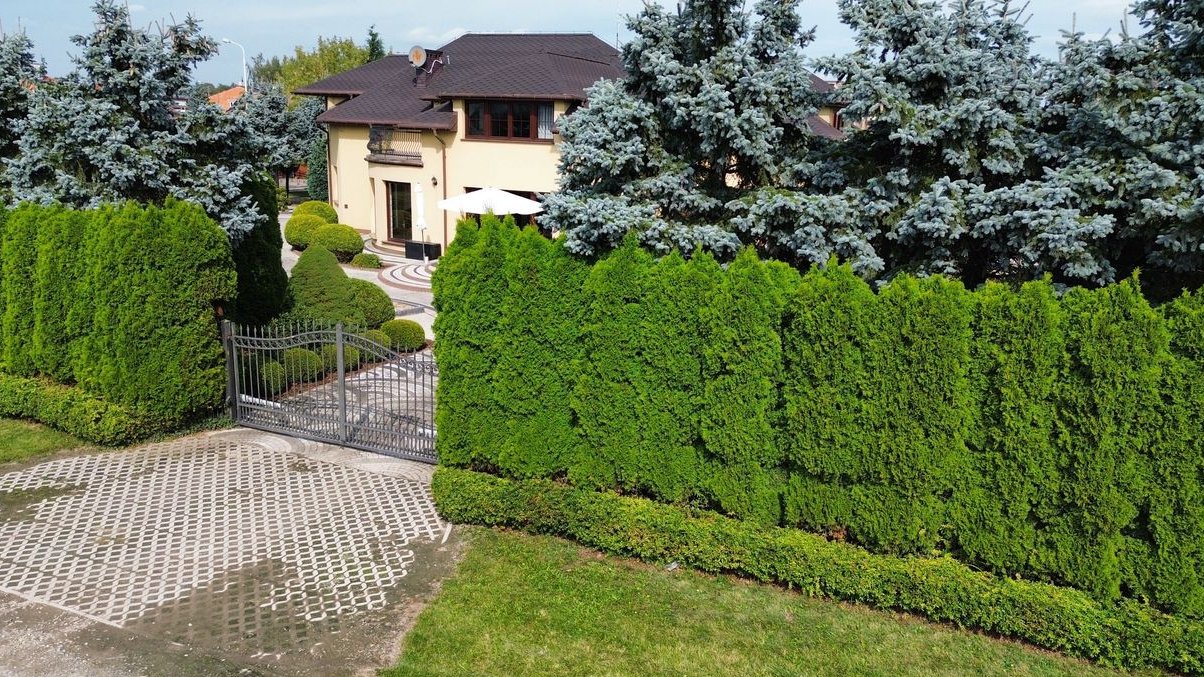 Działka o powierzchni 1900 m² jest starannie zagospodarowana – piękne nasadzenia tworzą przyjemną przestrzeń wypoczynkową i estetyczną otoczkę nieruchomości. Dwie bramy wjazdowe na teren, sterowane pilotami, zapewniają wygodny i bezpieczny dostęp do posesji.