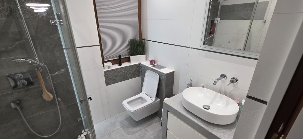 - komfortowa, duża łazienka o powierzchni 17,5 m, wyposażona w narożną wannę oraz dwie umywalki.