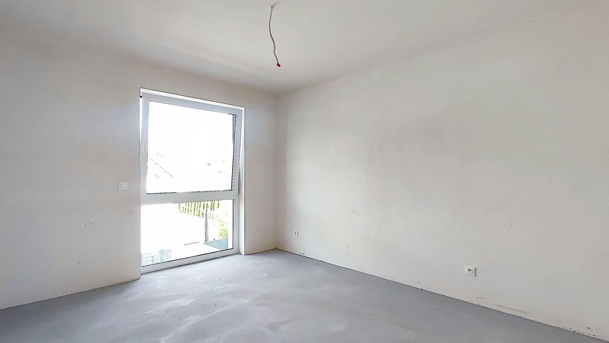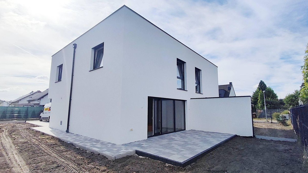 Trzyszybowe okna z elektrycznymi roletami dbają o ciszę i prywatność, a płaski dach pokryty membraną PVC dopełnia nowoczesny charakter budynku.