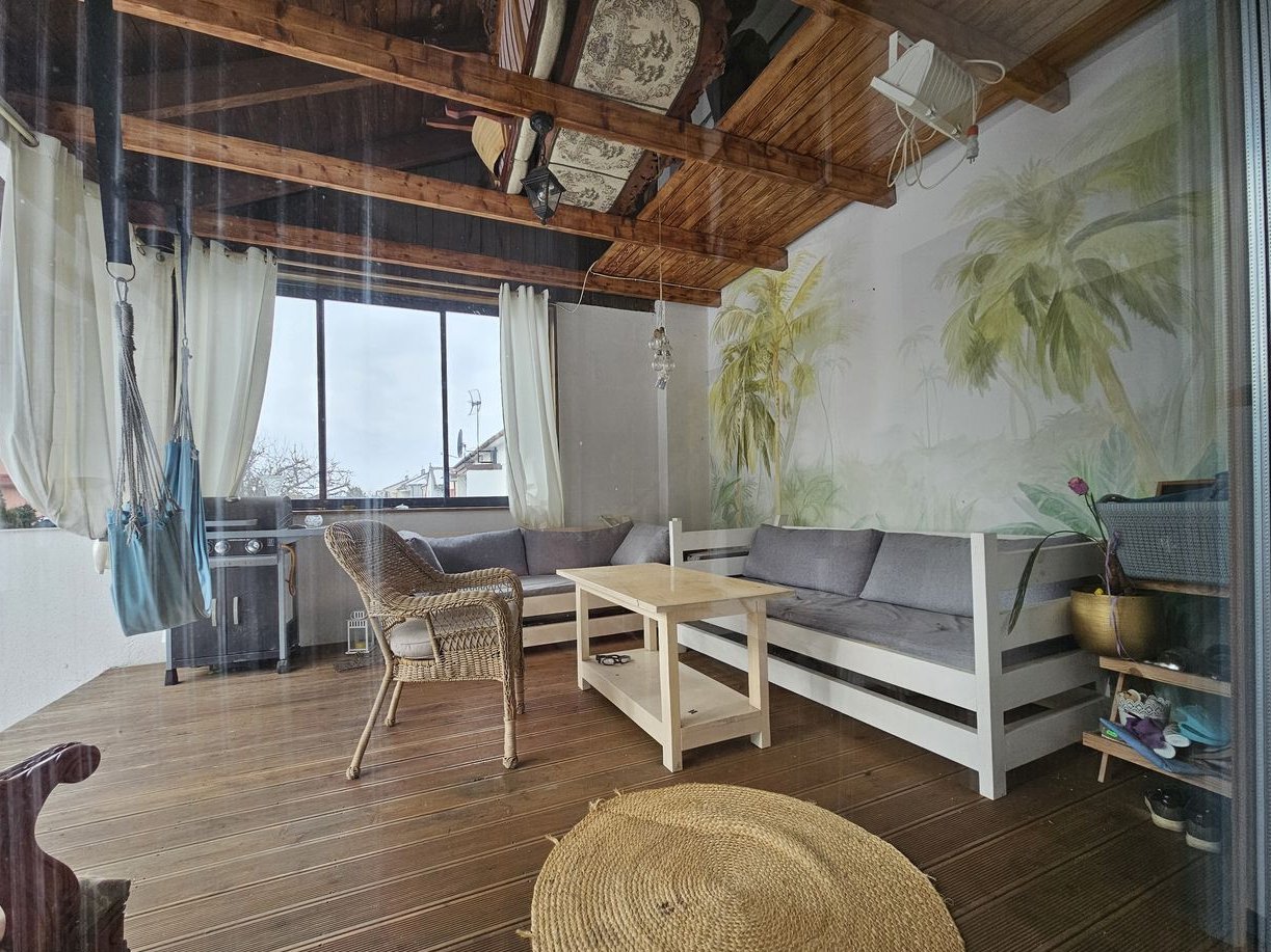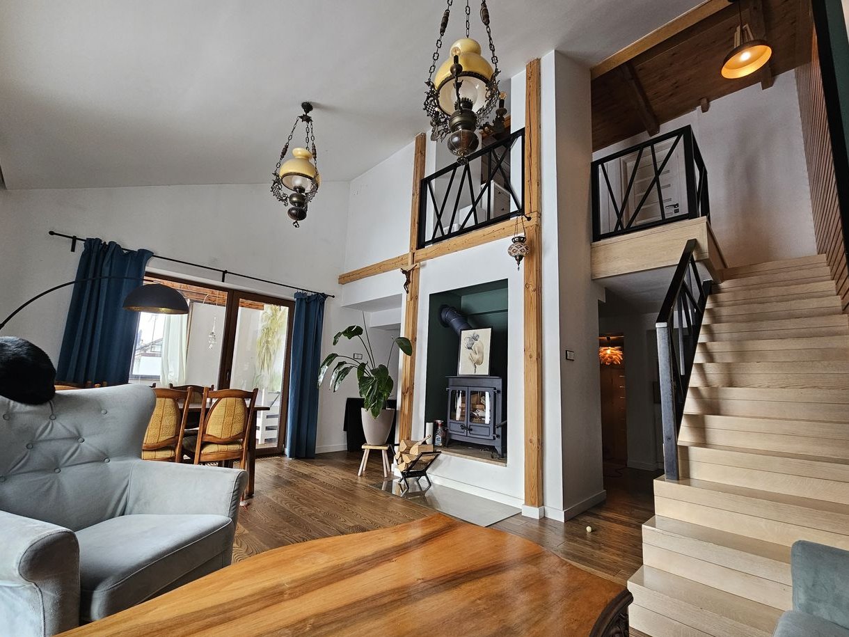 Wnętrze wyremontowane w stylu eklektycznym na naturalnych materiałach: jesionowa podłoga, drzwi drewniane, drewniane wolnowiszace schody. Na zewnątrz zagospodarowany ogród z basenem o wymiarach: 7/3 m. Do domu przylegają dwa wykonane z deski tarasy (jeden zadaszony)