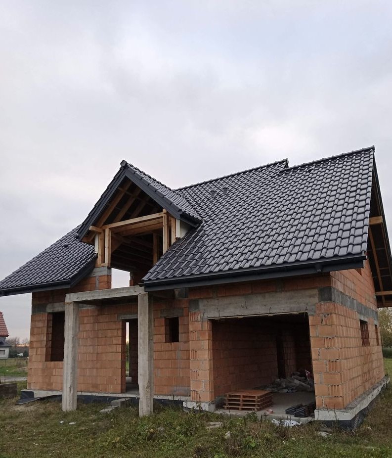 Dach pokryty dachówką, a ściany z betonowych materiałów