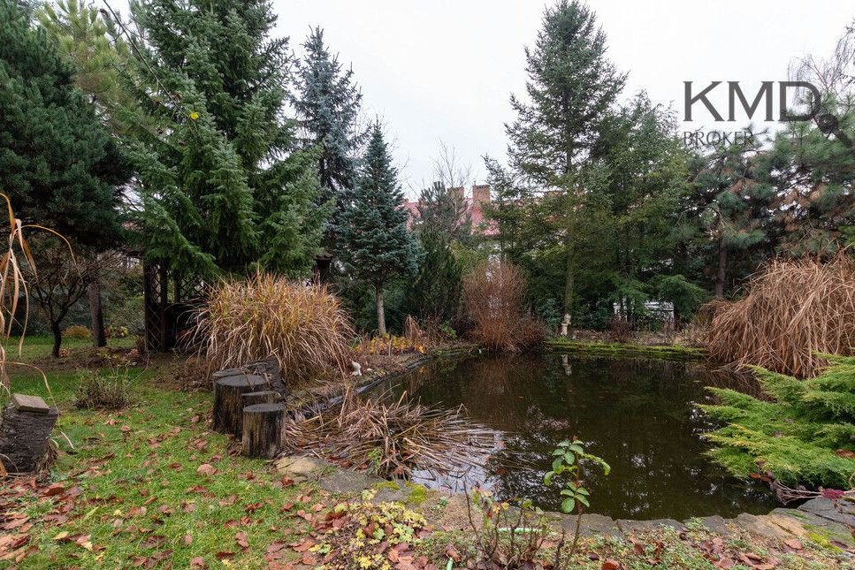 piękny, zadbany ogród z licznymi krzewami, drzewkami oraz oczkiem wodnym