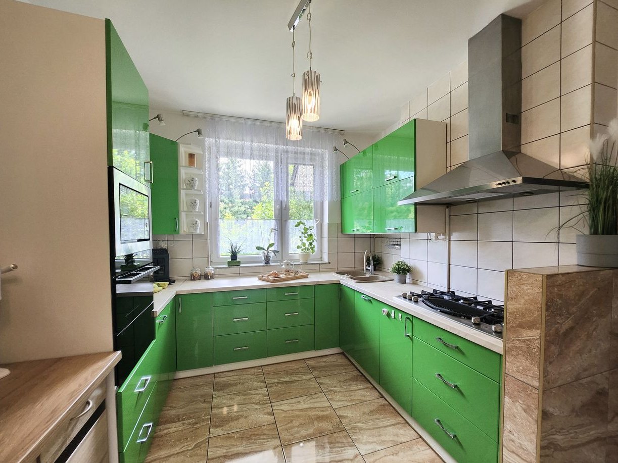 2 kuchnie – nowoczesna, jasna kuchnia z zieloną zabudową przyciąga wzrok i jest sercem domu.