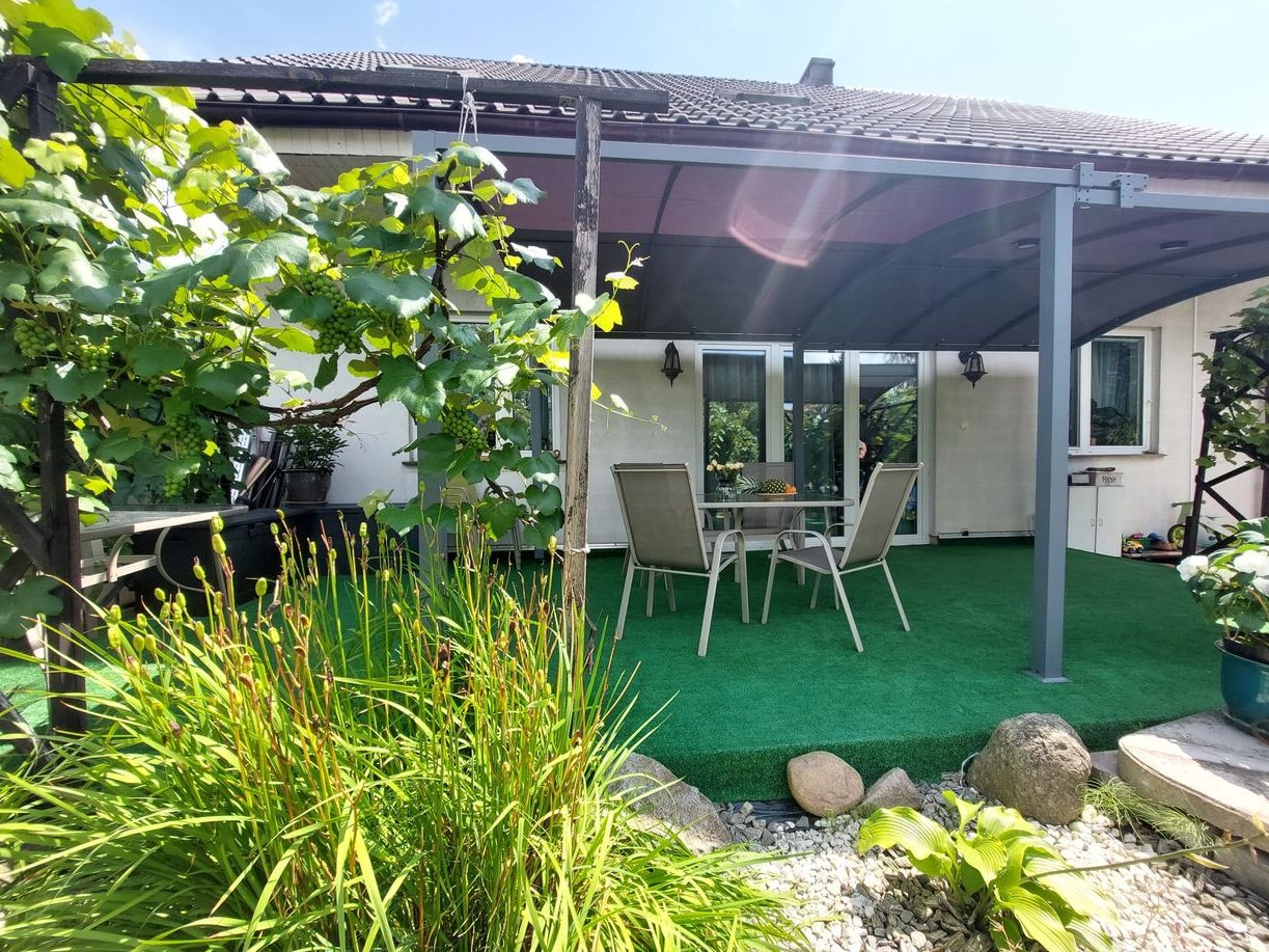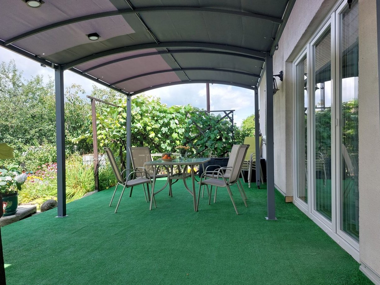 Zadaszony taras – idealny na rodzinne obiady, kawę o poranku czy wieczorne spotkania w gronie przyjaciół.