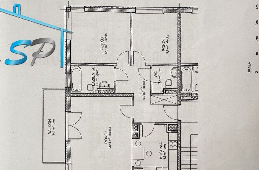 dwóch sypialni – 12,6 m² i 9,9 m²,