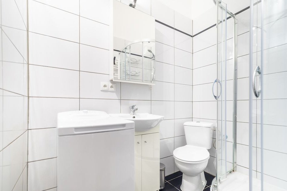 – łazienka z prysznicem, umywalką, pralką i WC