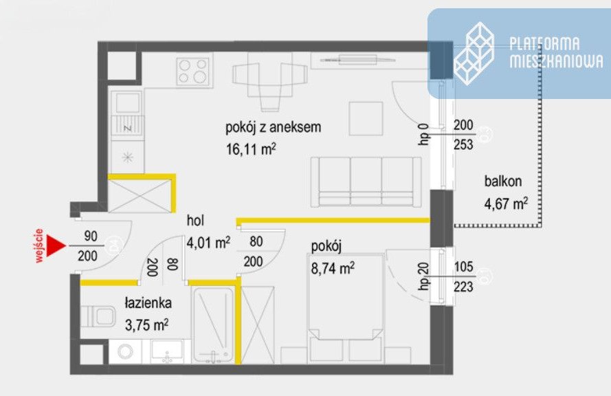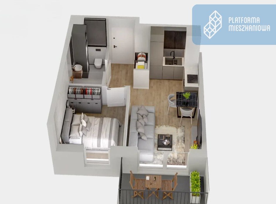 - Pokój dzienny z aneksem kuchennym i wyjściem na balkon