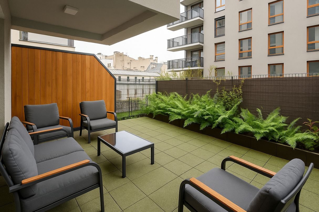 Duży taras (ok. 23 m²) – częściowo zadaszony, z widokiem na wewnętrzny dziedziniec
