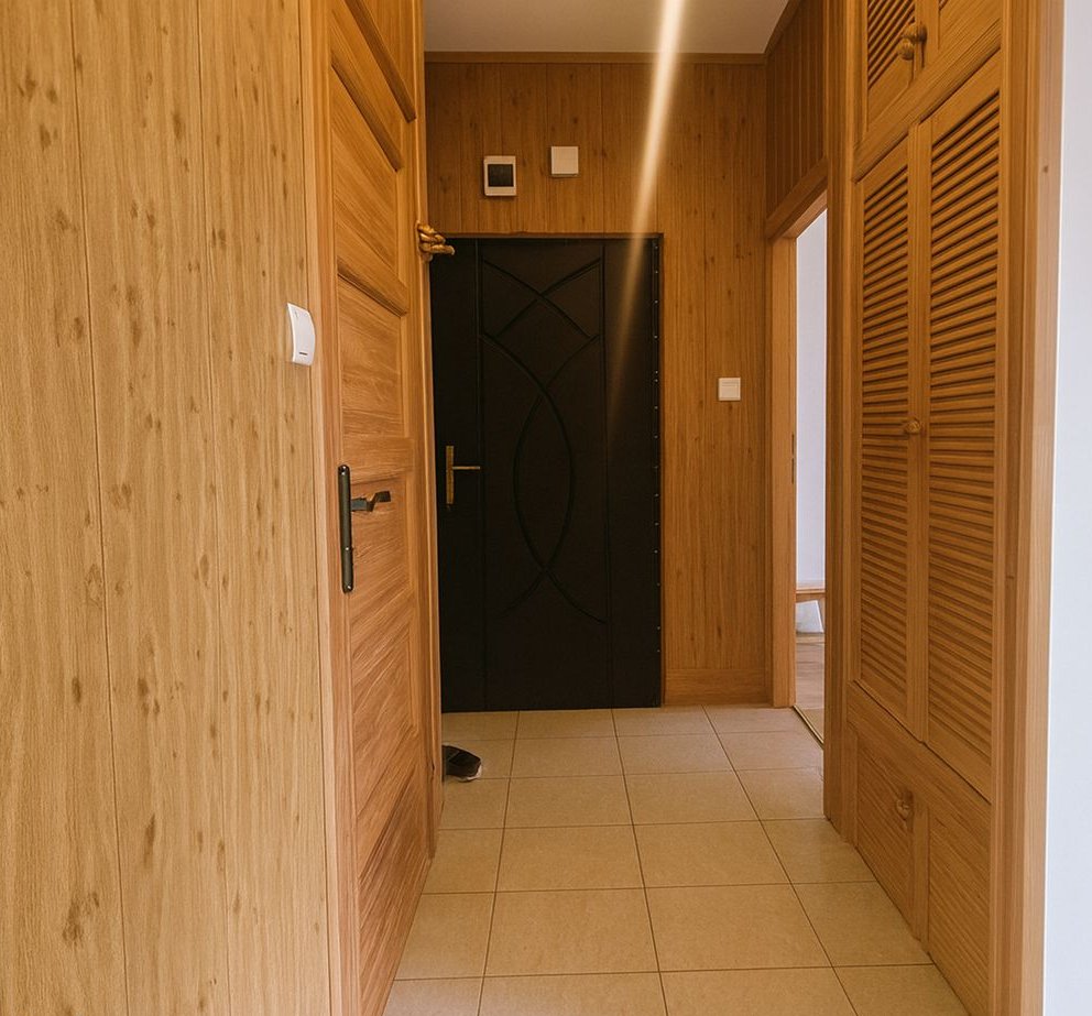 Przedpokój z praktyczną wnęką na okrycia i sprzęt.