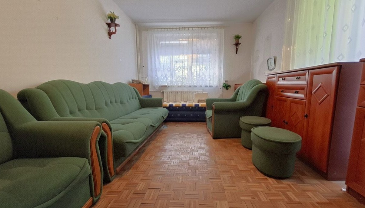 salon: przestronny i ustawny, z klasycznym parkietem na podłodze