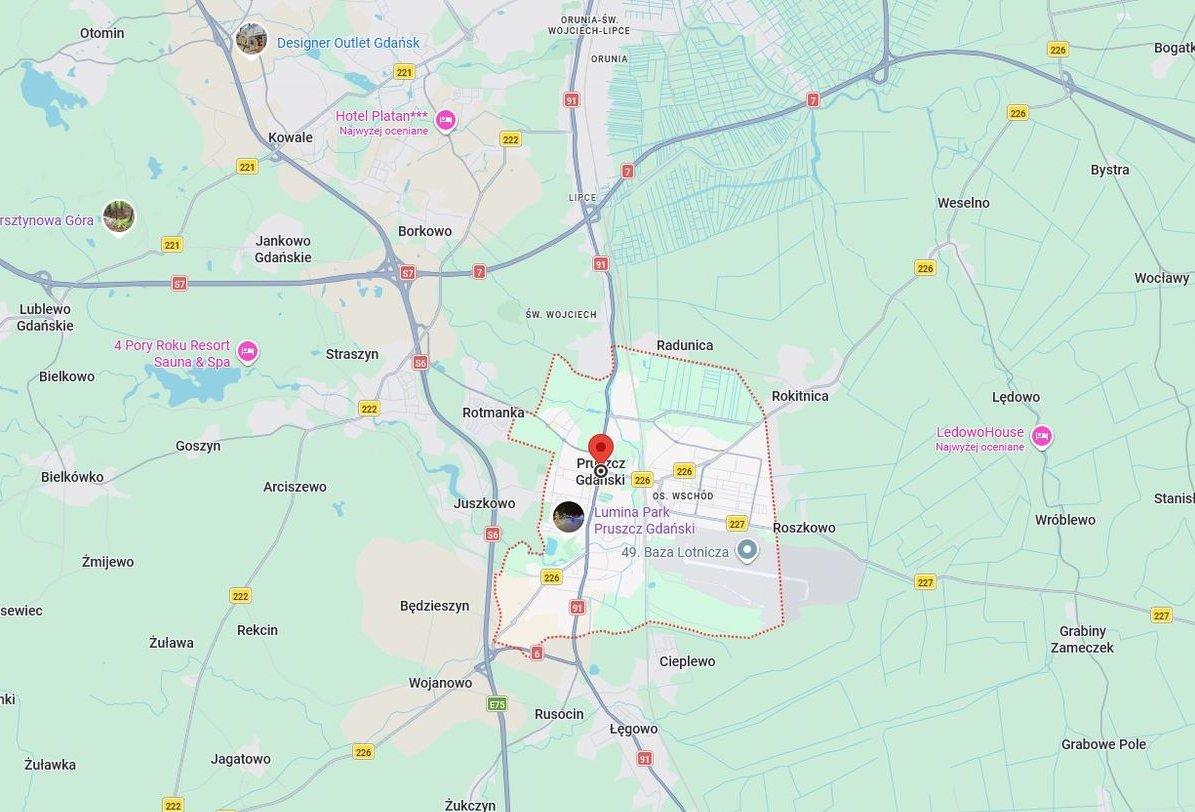 Mieszkanie znajduje się w Pruszczu Gdańskim, w lokalizacji idealnej dla osób ceniących ciszę. Budynek usytuowany jest na uboczu, co gwarantuje spokój, a jednocześnie pozwala na dotarcie do ścisłego centrum miasta w zaledwie kilka minut. W pobliżu znajduje się pełna infrastruktura: sklepy, punkty usługowe oraz tereny spacerowe.