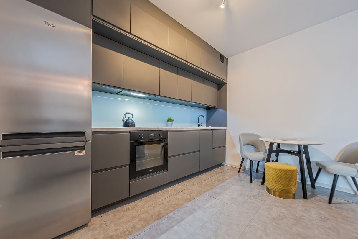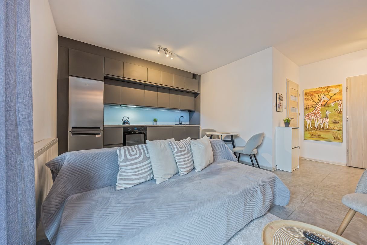 Salon z aneksem kuchennym (19,98m2): Kuchnia jest w pełni wyposażona (lodówka, piekarnik, płyta, okap) w nowoczesnej, ciemnej zabudowie. Salon jest jasny i ustawny, z bezpośrednim wyjściem na taras.