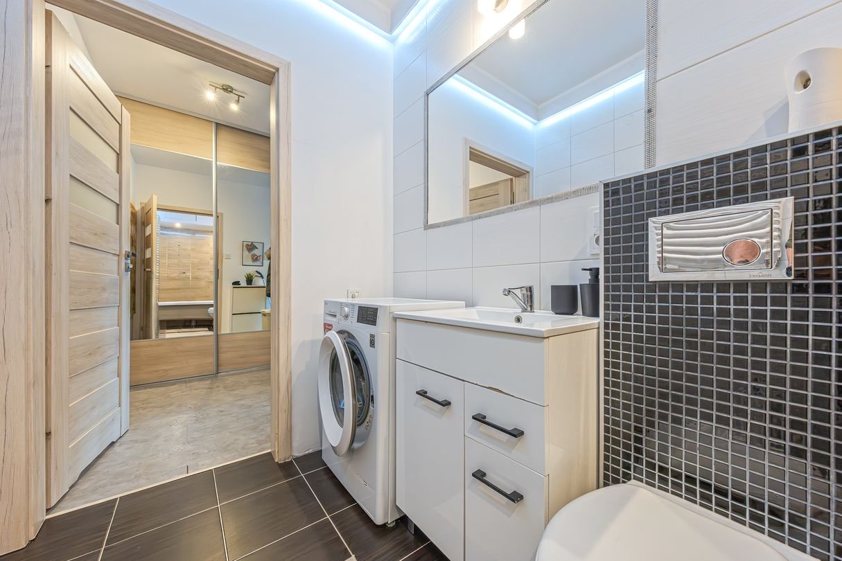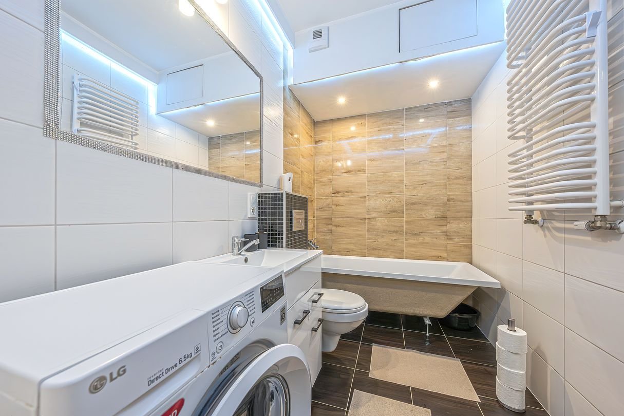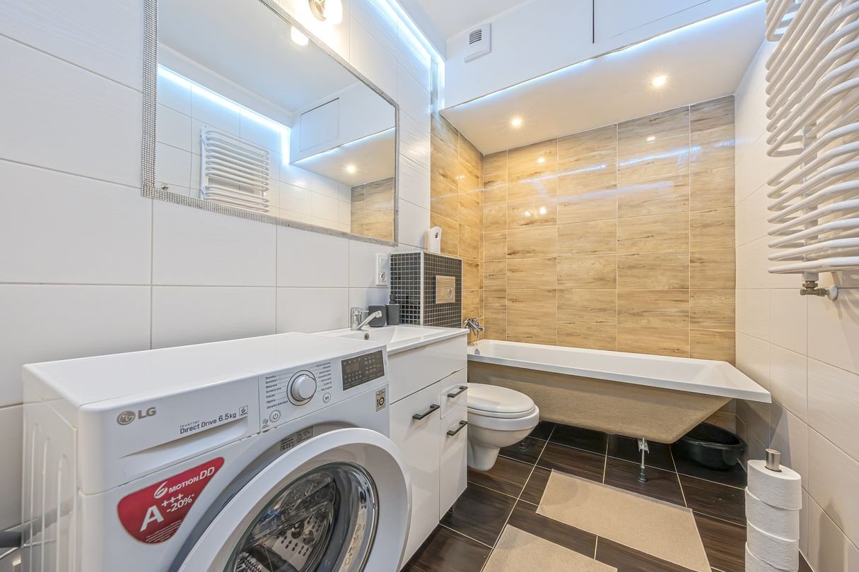 Łazienka (4,47m2): Czysta i nowoczesna, wyposażona w wannę, pralkę oraz sporo miejsca na kosmetyki.