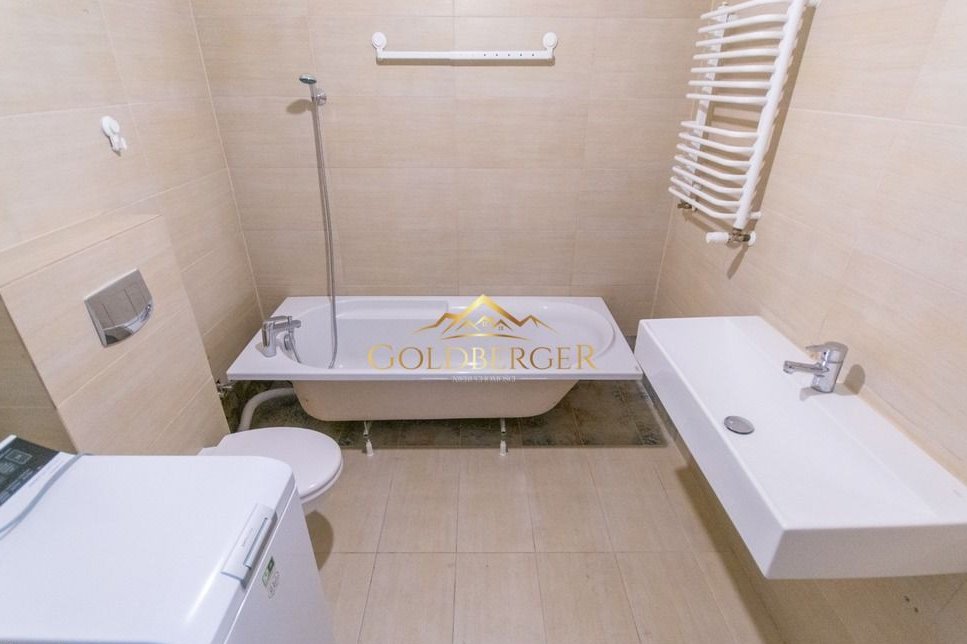 Łazienka jest bardzo ustawna. Znajduje się w niej wanna ale można ją przearanżować na prysznic. Posiada miejsce na pralkę oraz praktyczne szafki do przechowywania. Jasna kolorystyka dodatkowo podkreśla wrażenie przestrzeni i czystości.