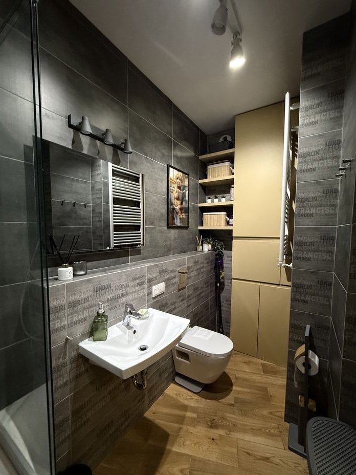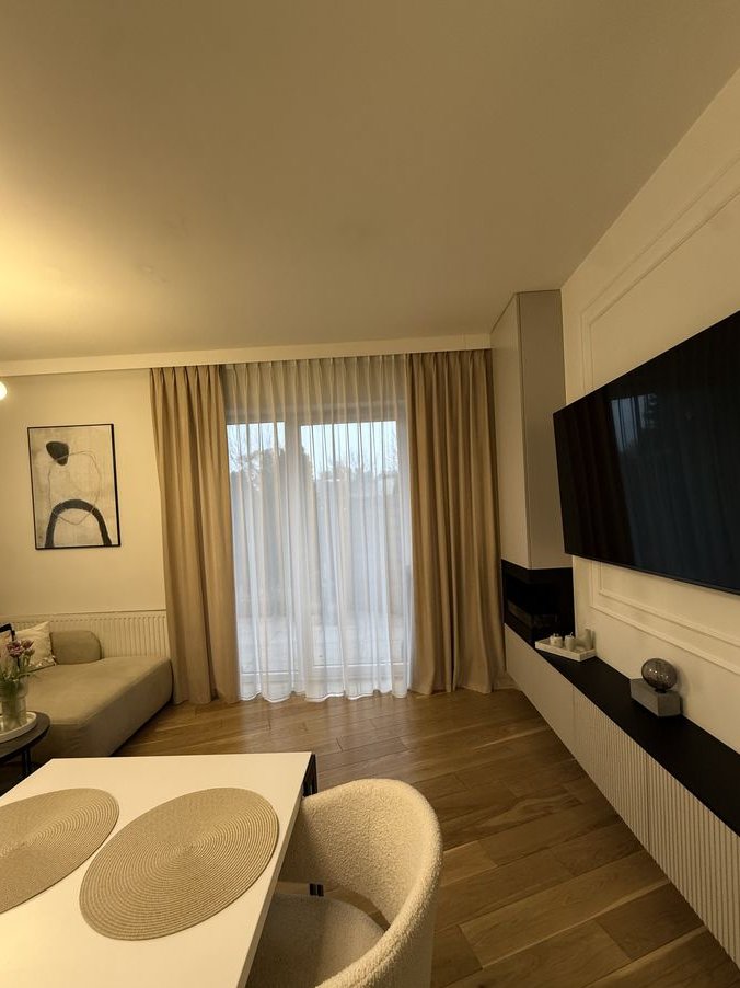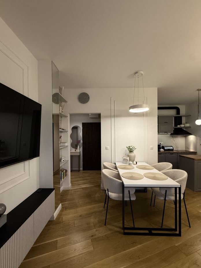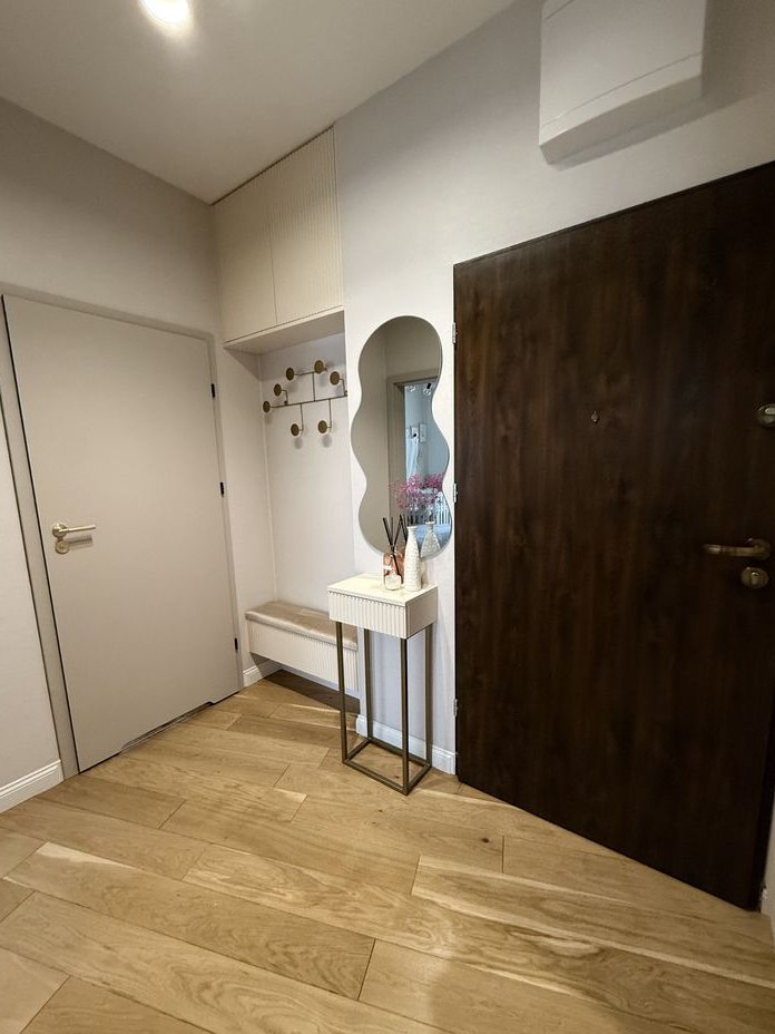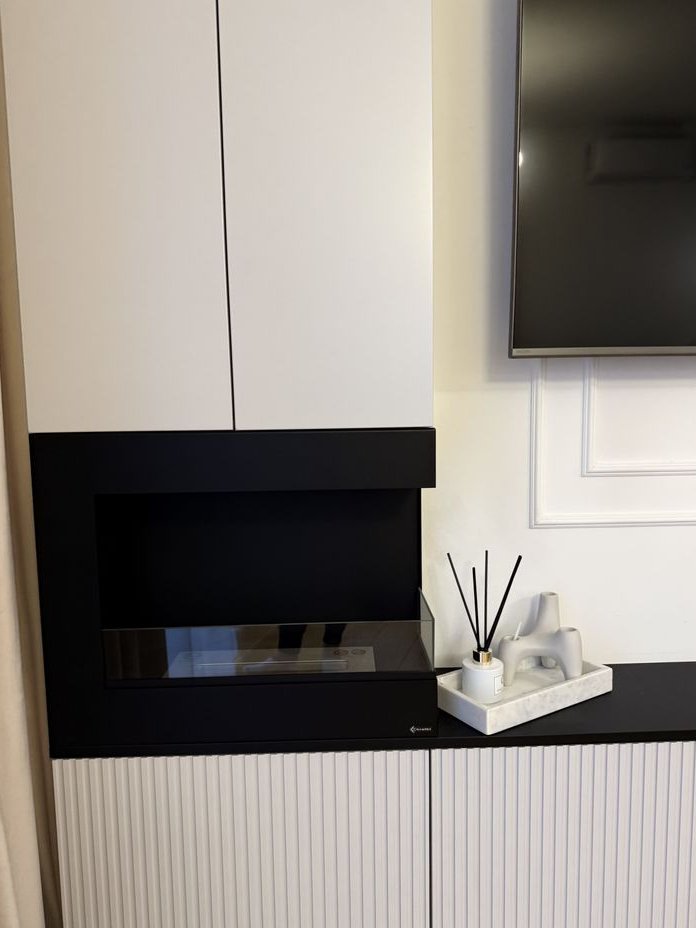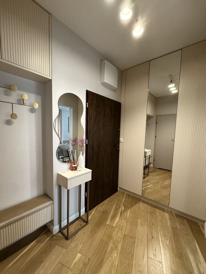 Mieszkanie przeszło niedawno remont. Wszystkie meble wykonano w zabudowie, aby maksymalnie wykorzystać przestrzeń i zapewnić dużo miejsca do przechowywania. Na podłodze znajduje się drewniana deska, a komfort podnoszą klimatyzacja oraz biokominek. Wnętrze jest jasne, przestronne i bardzo funkcjonalne.